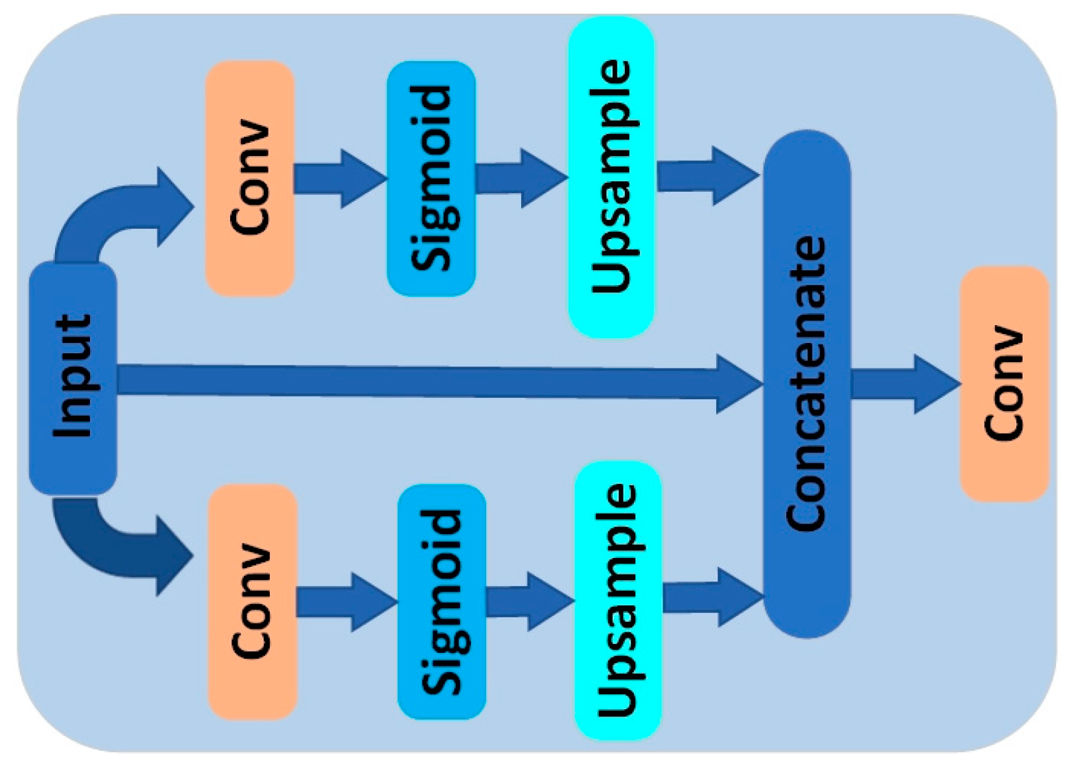 The features at different scales are then upsampled to the original resolution and concatenated with the original feature map, forming a feature map with a depth of number_of_channels × 3 (integrating features from the original and two attention-enhanced paths).