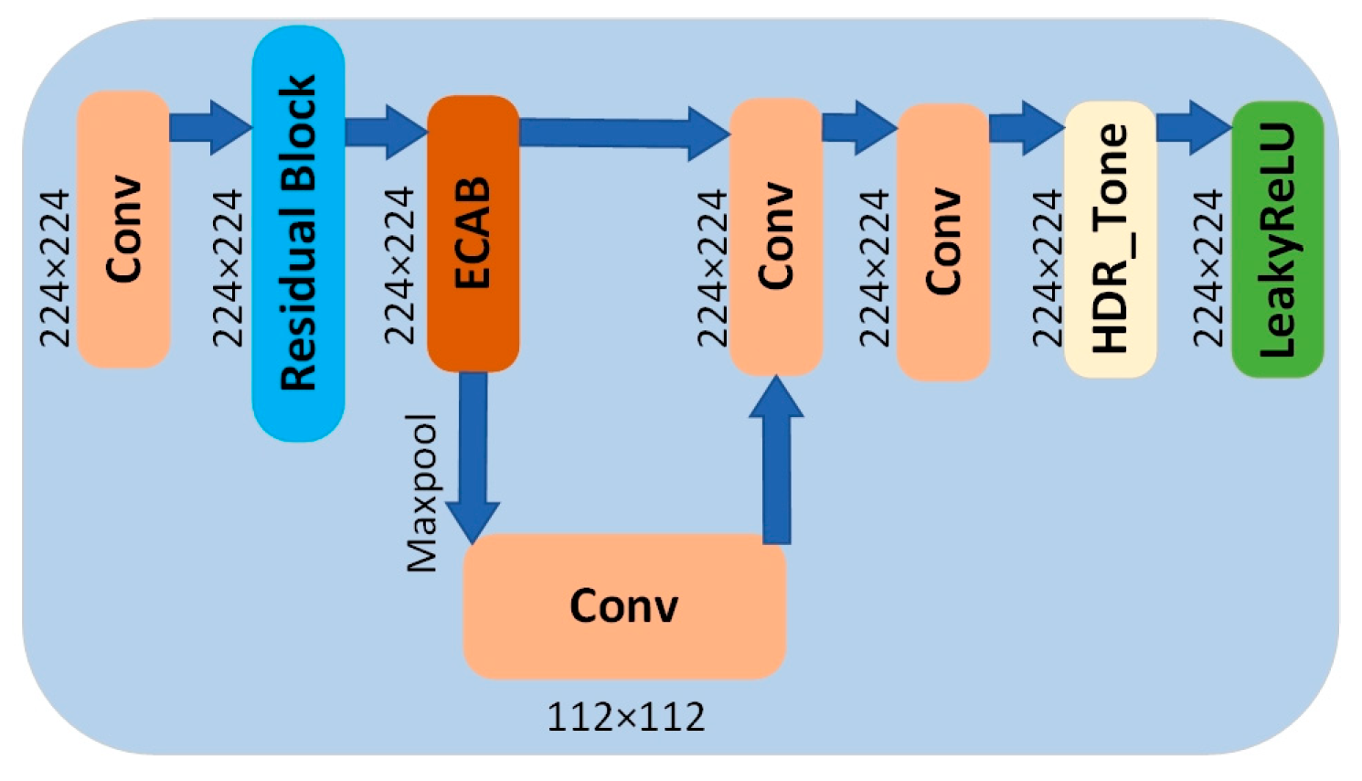 Efficient channel attention (ECA) mechanism: To balance performance and computational efficiency, RECAD incorporates an ECA module. This mechanism adaptively recalibrates channel-wise feature responses without significantly increasing parameters or computational load, thereby enhancing the network’s discriminative feature extraction capability and overall enhancement quality.