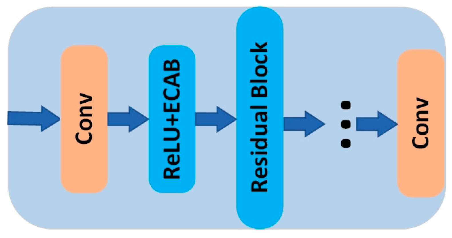 The refinement module has a simple and efficient structure, built around multiple convolutional layers with a kernel size of 3 and padding of 1. Consistent with the earlier decomposition module, this module also incorporates Residual Blocks and ECABlocks to further strengthen its feature extraction and reconstruction capabilities. The residual structure effectively alleviates the vanishing gradient problem and facilitates deep network training, while the ECABlock adaptively calibrates feature weights through a channel attention mechanism, suppressing irrelevant noise and highlighting important details.