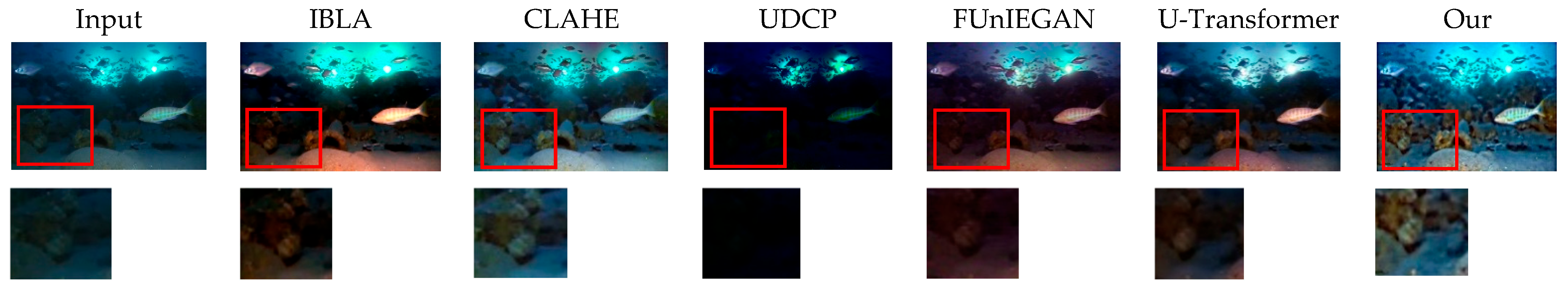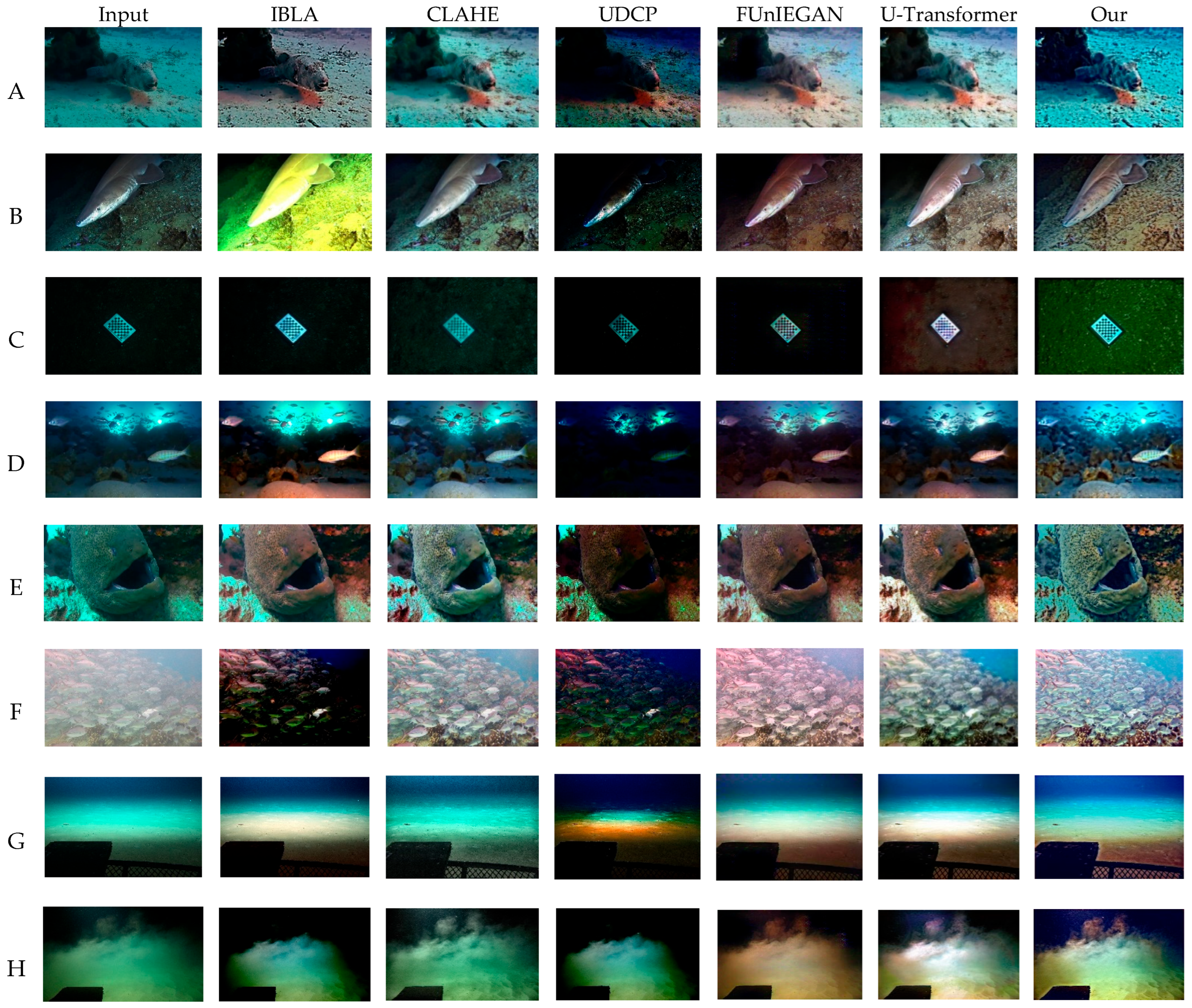 In this experiment, the proposed RECAD was compared against a range of techniques spanning multiple methodological categories in underwater image enhancement (UIE). Among traditional methods, we selected IBLA, CLAHE, and UDCP, representing classical approaches to UIE. For deep learning-based methods, we evaluated two advanced models: FUnIEGAN (an end-to-end GAN-based model focused on realistic enhancement and color correction of underwater images) and U-Transformer (a network utilizing the Transformer architecture to capture long-range dependencies for improving global consistency and detail recovery in underwater scenes). Comparative analysis with these representative methods was conducted to comprehensively measure the performance of RECAD.
