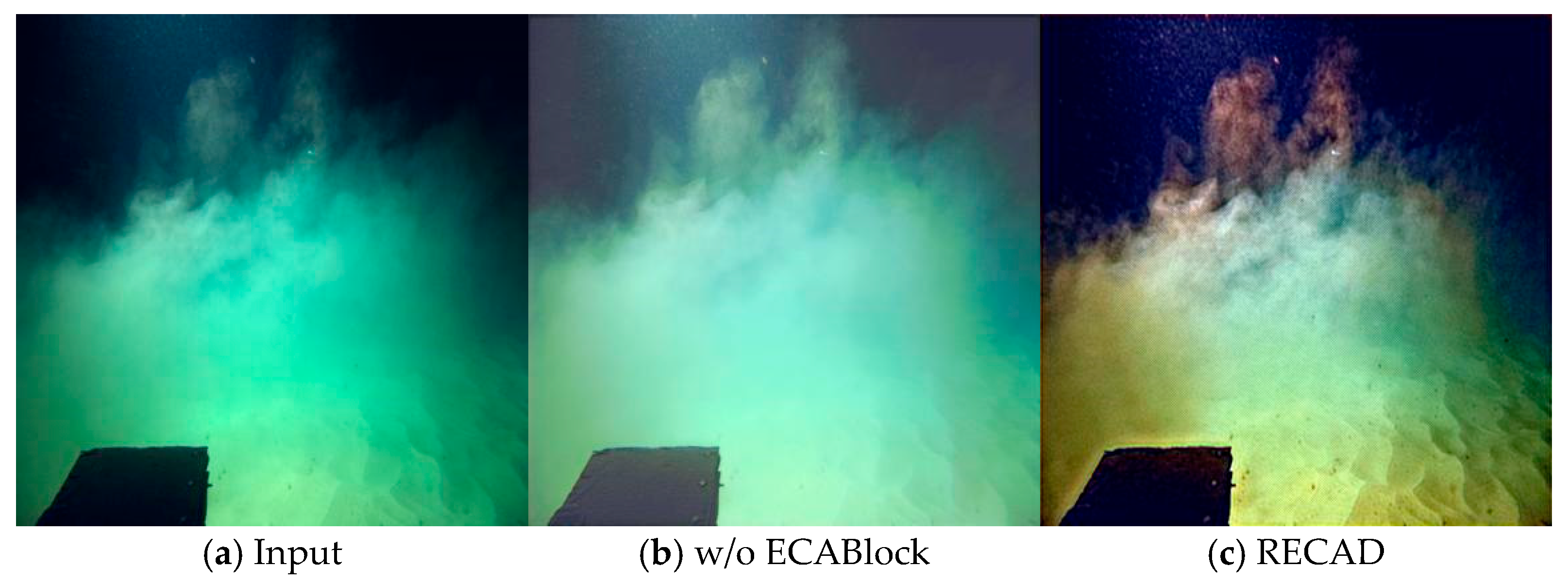 Figure 9b,c, where the output without ECABlock exhibits noticeable deficiencies in both color fidelity and detail clarity. Specifically, the image processed without ECABlock appears less vibrant with inferior color restoration, and fine structural details are less distinct compared to the result from the complete model with ECABlock, which demonstrates more natural color distribution and enhanced textualural details. The absence of the Denoising Module resulted in a PSNR decrease of 2.27 dB and an SSIM decrease of 0.07, so this module contributes significantly to suppressing underwater noise and artifacts, directly affecting the image’s signal-to-noise ratio and structural integrity. In comparison, the Dark Area Detection Module, focused on enhancing details in local dark regions, caused a PSNR drop of 1.87 dB and an SSIM drop of 0.05 upon removal, indicating its important auxiliary function in improving visual visibility. The Refinement Module, as a post-processing optimization unit, had the relatively smallest impact; its removal still led to a PSNR decrease of 1.27 dB and an SSIM decrease of 0.02, reflecting its supplementary role in detail recovery and edge optimization.