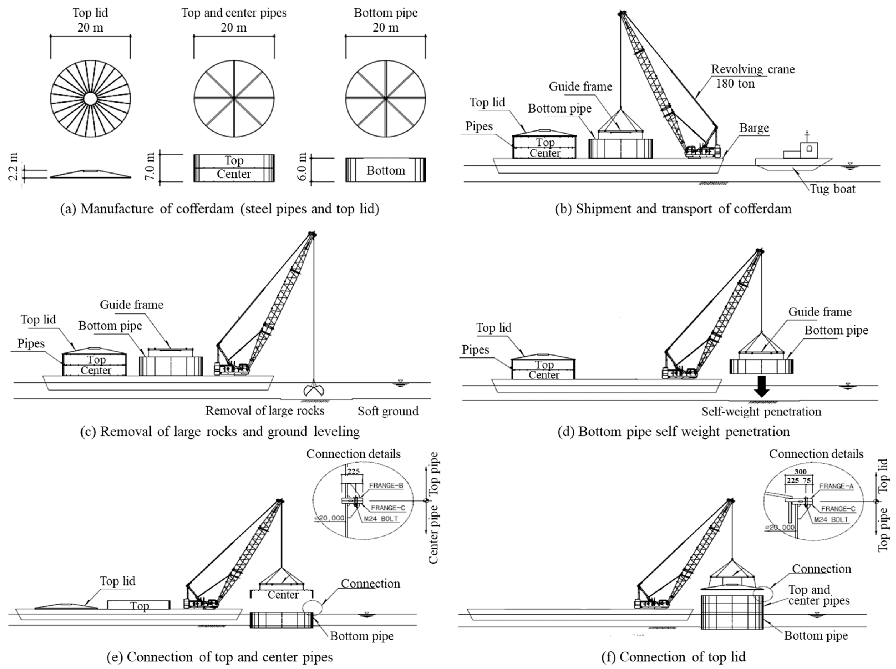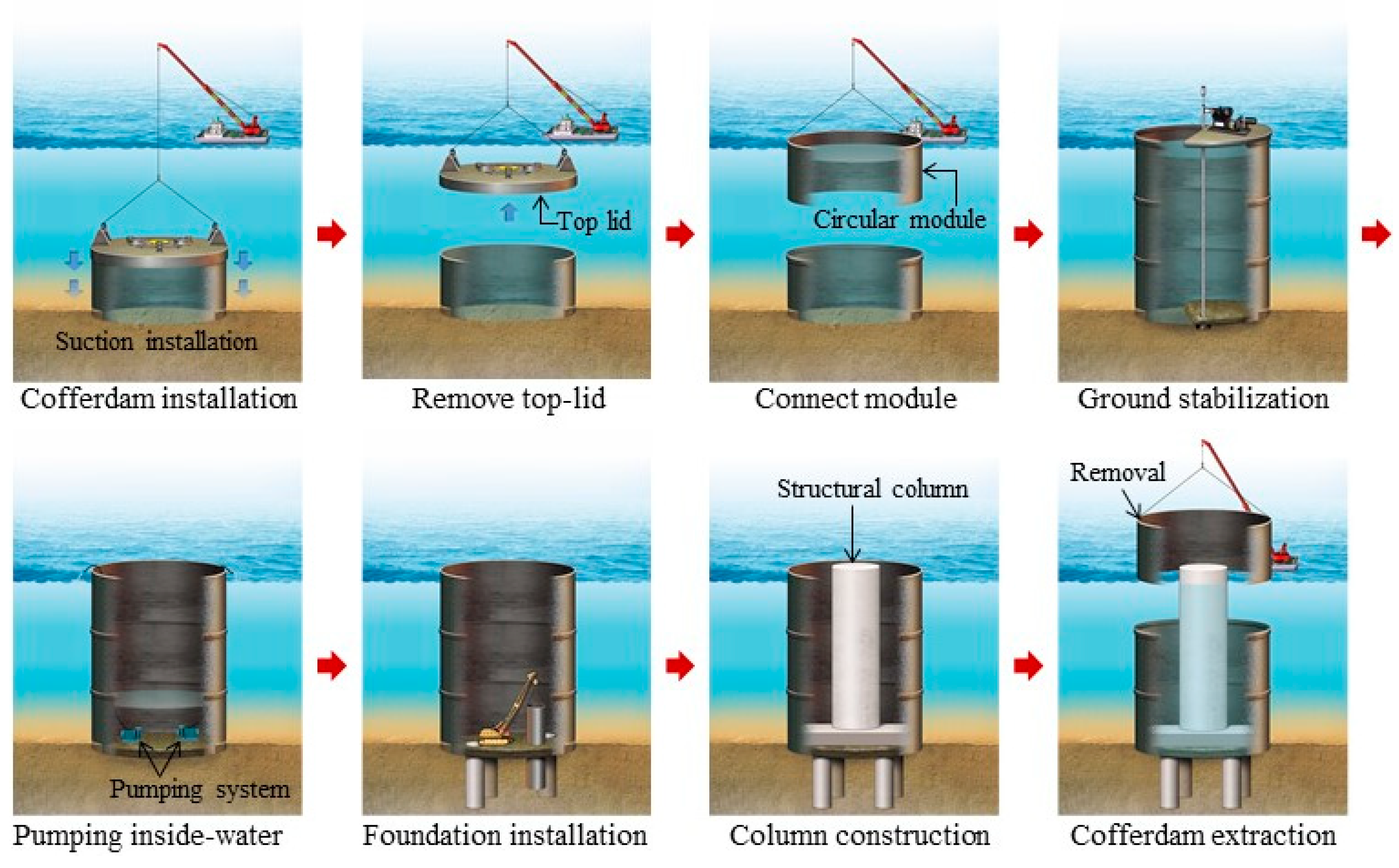 13]. Once the initial penetration is secured, the temporary top lid is removed, and additional circular modules are connected vertically to achieve the required height. This modular assembly minimizes the lifting weight of each segment and facilitates offshore handling. Subsequently, ground stabilization inside the cofferdam is performed through soil improvement or seabed preparation to ensure a stable working platform.