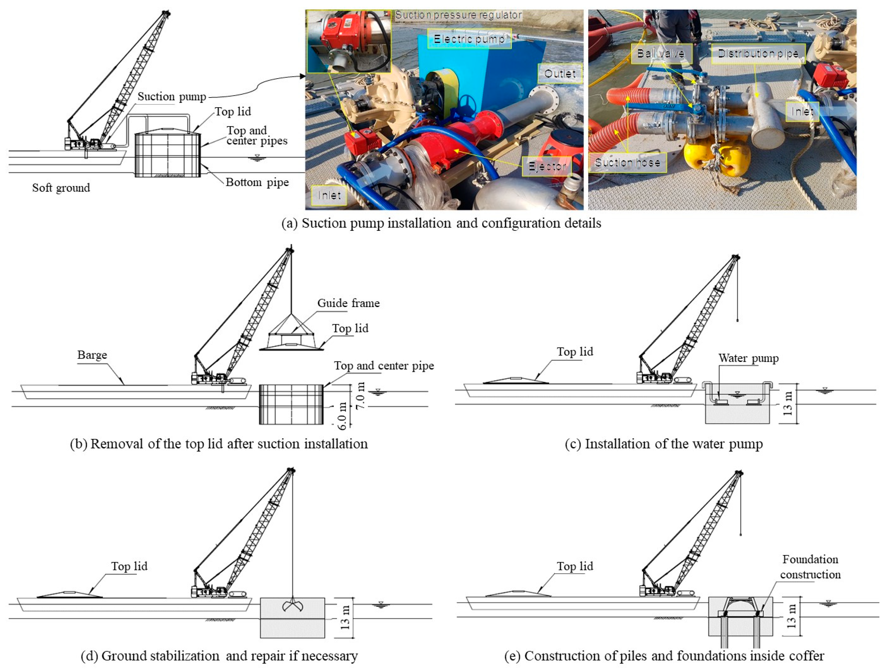 Following stabilization, the water that is trapped inside the cofferdam is pumped out, creating dry or semi-dry working conditions for foundation works. Subsequently, the structural foundation elements, such as piles or footings, are installed within the enclosed space. The vertical structural column is then constructed inside the cofferdam at the designated elevation. Finally, once the permanent foundation and column have been completed, the cofferdam is removed by reversing the suction pressure, which allows for efficient extraction without disturbing the installed foundation. This sequence highlights the dual functionality of suction pressure in both installation and removal, demonstrating the engineering efficiency of the method.