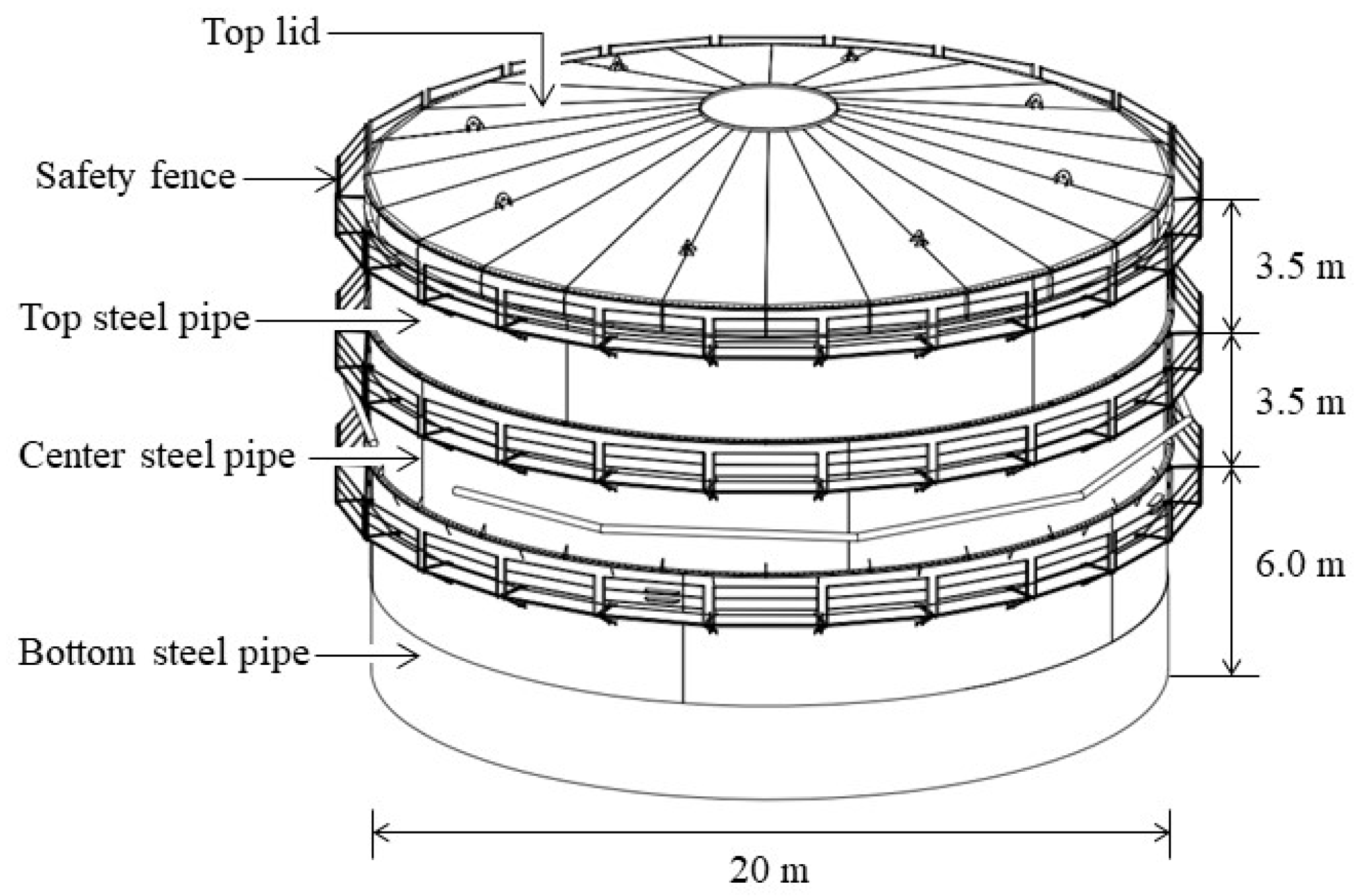 Figure 4 shows a schematic of the steel pipe cofferdam. A prototype with a diameter of 20 m was fabricated to apply the circular cofferdam construction technology to offshore field conditions. Considering the specifications of available offshore lifting equipment, the cofferdam was designed and manufactured using single steel plates with a yield strength of 355 MPa. The system consists of an arched top lid and top, a center, and a bottom steel pipe.