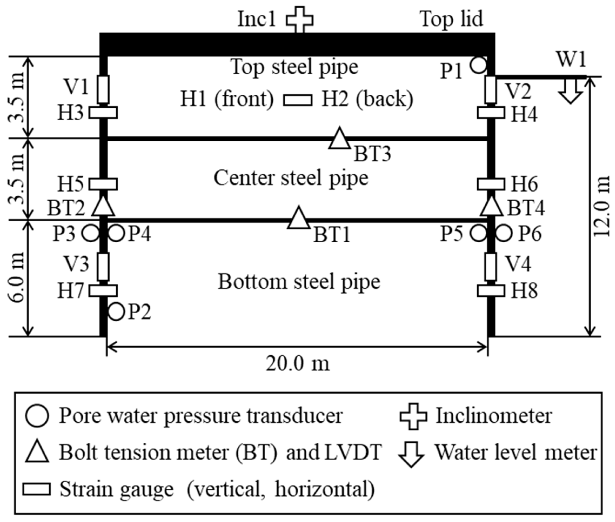 Twenty-four sensors were attached to the cofferdam across the different measurement categories. These included six pore water pressure transducers (four internal and two external), 12 strain gauges (eight horizontal and four axial), four bolt load cells, an LVDT at the flange connections, one water level gauge, and one biaxial inclinometer. This monitoring system enabled continuous observation of the suction pressure, pore water pressure variation, structural deformation, connection performance, vertical alignment, and installation rate.
