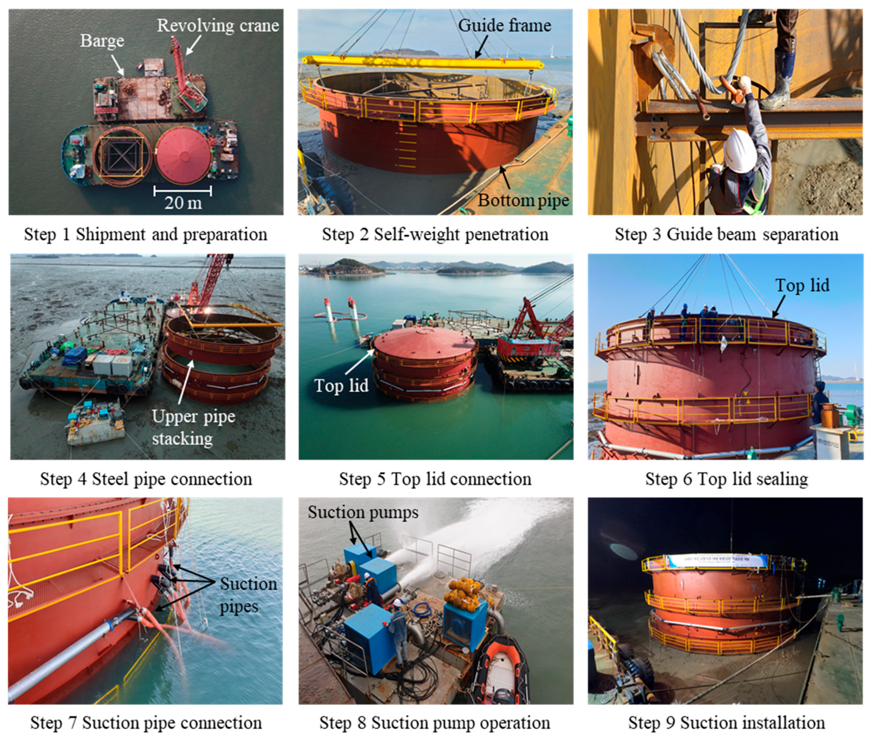 Figure 1. First, the cofferdam is installed through self-weight penetration and suction. The suction-driven installation mechanism of the cofferdam is conceptually similar to the bucket foundation technology, which has been widely applied in offshore wind and oil platforms [