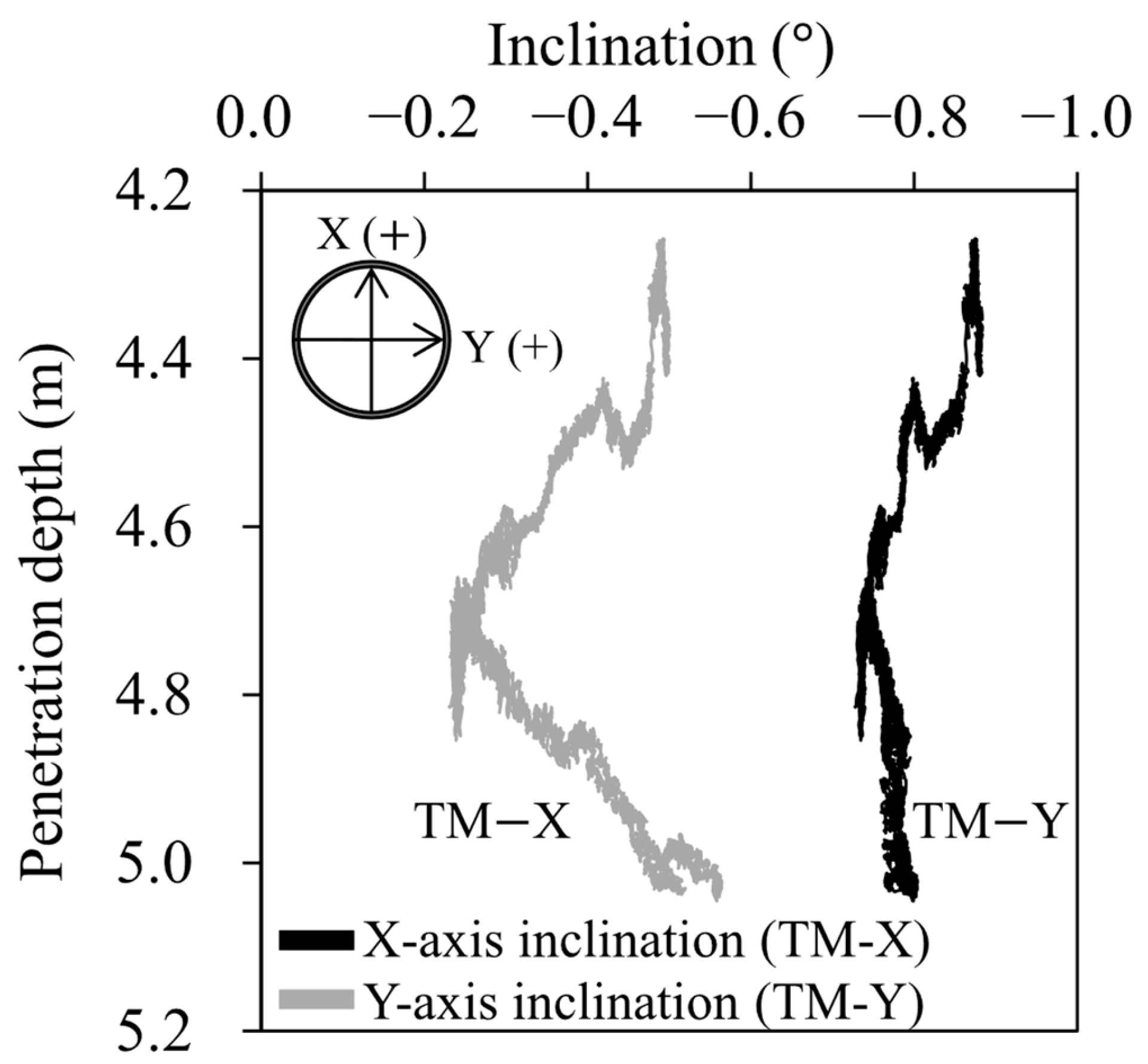 Inclination changes of less than 1° were observed despite tidal fluctuations. Although such deviations were not significant for constructability, they highlight the importance of controlling the alignment during the early penetration stage. Similar conclusions were drawn by Park et al. [