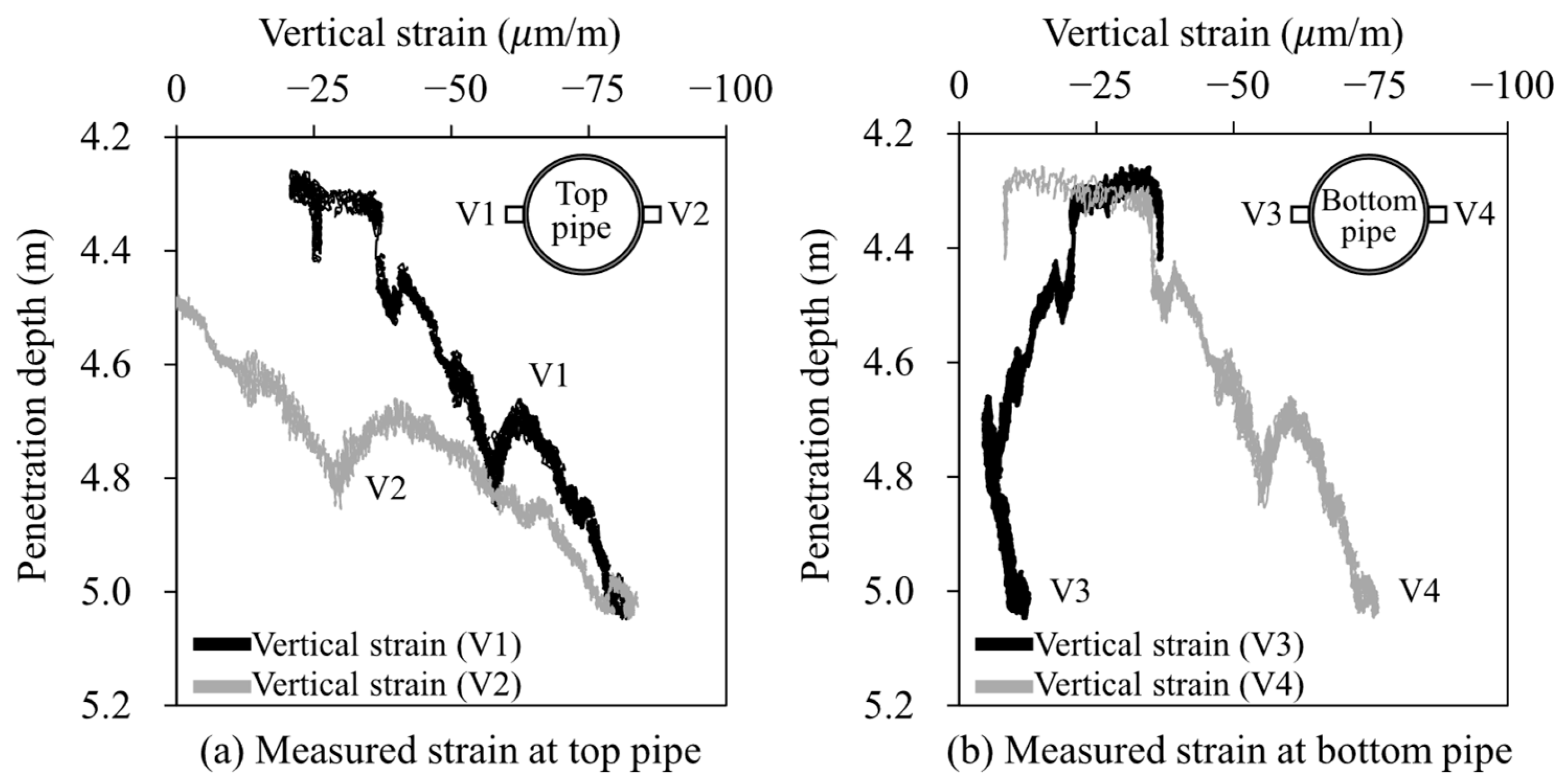 Figure 12a,b indicate that vertical compression was relatively uniform across the height of each segment, suggesting that the axial membrane forces developed gradually as the structure penetrated deeper. The similarity of magnitudes between the top and bottom pipes implies that global bending of the wall was limited and that the shell primarily acted in membrane compression rather than flexural distortion. This behavior is theoretically consistent with a thin cylindrical shell subjected to external pressure, where axial strains are secondary to the dominant circumferential action.