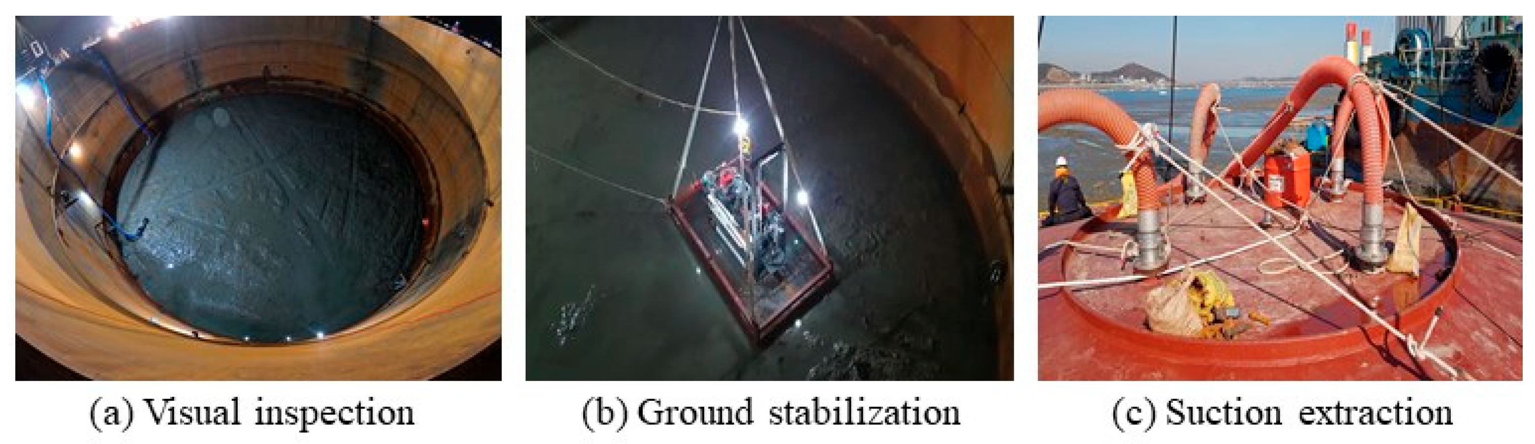 Figure 15, the cofferdam was successfully penetrated to the target depth of 5 m by suction without inducing soil failure, and ground-sealing equipment was deployed to demonstrate stabilization. The interior of the cofferdam remained effectively sealed from external seawater even during high tides caused by tidal fluctuations, thereby confirming its functionality and performance as a cofferdam.