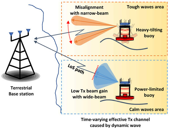 The growing demand for advanced maritime applications, such as surveillance, environmental monitoring, offshore platform management, and disaster response services, requires buoy-based ocean communication networks [1,2]. In particular, lighthouses and maritime buoys now play a critical role, going beyond simple signaling to transmitting real-time environmental and situational data including wave height, surrounding visibility, and environmental video feeds. These high data-rate requirements necessitate more efficient wireless transmission strategies than the low-rate, omnidirectional links traditionally used for basic telemetry (e.g., wave height, air temperature).