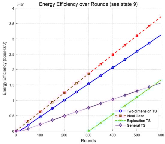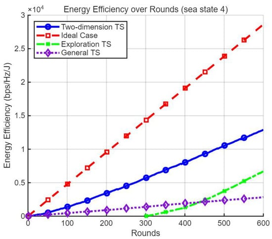 In this section, we present simulation results that quantitatively demonstrate the effectiveness of the proposed 2DTS algorithm in selecting the optimal beamwidth and transmit power under varying sea states. Performance is measured in terms of cumulative energy efficiency () in iterative rounds. Here, r represents the achieved data rate (in bps/Hz) obtained from the simulation, rather than the binary success indicator used within the Thompson Sampling process. Accordingly, the energy efficiency (EE) metric has the physical unit of bits/Joule/Hz, consistent with the standard definition of spectral energy efficiency. For clarity, all relevant figures are labeled as “Energy Efficiency (bps/Hz/J)”. In buoy-based maritime uplinks, energy efficiency (EE) is a primary design objective due to strict power budgets. Throughout this section, we use , where r denotes the achieved rate in bps/Hz (i.e., spectral efficiency, SE). Hence, EE implicitly captures SE in its numerator while simultaneously reflecting the rate–power trade-off that is central to battery-constrained buoy operation. In our target-rate setting, methods that satisfy the reliability constraint yield comparable SE at the threshold, so the observed EE gains of 2DTS primarily arise from using lower transmit power to meet the same target. Qualitatively, therefore, SE trends are consistent with the reported EE improvements. Figure 2 and Figure 3 show the energy efficiency achieved by four schemes: (i) an ideal case that assumes perfect prior knowledge of the optimal beamwidth and power at each round and (ii) the proposed 2DTS algorithm. (iii) The “modified TS with a dedicated exploration phase” (Exploration TS) follows an explore–then–commit protocol over the joint action space of beamwidth and power. During the first rounds, actions are sampled uniformly (no exploitation) and beta posteriors are updated from binary success/failure. At , the algorithm commits to a single pair: among arms whose posterior-mean success probability meets the target reliability, it picks the minimum-power configuration; if none is feasible, it selects the arm with the largest posterior mean and uses it for the remaining rounds and (iv) a conventional TS that independently selects beamwidth and power using standard TS. As shown in Figure 2, under a moderate sea state (sea state 4), the proposed 2DTS achieves an energy efficiency of approximately (bps/Hz/J) at round 600, which is 73.5% of the ideal case performance ( (bps/Hz/J)). This result clearly outperforms both the exploration-based variant () and the conventional TS (), indicating relative gains of 96.9% and 447.8% over the exploration-based and conventional TS baselines, respectively. As shown in Figure 3, for a harsh sea state (sea state 9), the performance gap narrows further. In round 600, 2DTS achieves (bps/Hz/J), corresponding to 85.6% of the ideal case (), while exploration TS and conventional TS reach and , respectively. This translates to a performance gain of 84.0% over conventional TS, again highlighting the robustness of the 2DTS framework in dynamically fluctuating maritime environments. The superior performance of 2DTS arises from its joint optimization structure.