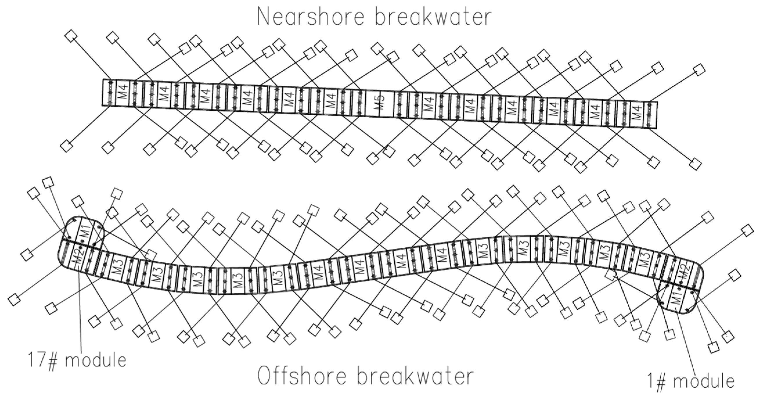 The tensions in the mooring lines of the head module generally exceed those of the tail module and are more sensitive to wave parameter variations. The horizontal wave pressure on the seaward face of the FBs exceeds that on the leeward face. Although the downward pressures on the top surfaces of the head and tail modules are nearly identical, the uplift pressure on the tail module is greater. Additionally, the uplift pressures on the two modules remain relatively constant as wave height and period increase, with the maximum prototype-scale changes being +2.3 kPa and −5.6 kPa, respectively. However, the head module experiences increased horizontal pressure and reduced downward pressure, whereas the tail module shows the opposite trend. In the future, further experiments will be conducted to investigate the relative motion between the offshore and nearshore breakwaters, the causes of the extreme values of wave heights, motion responses and mooring tensions, and the risks associated with mooring line failure.