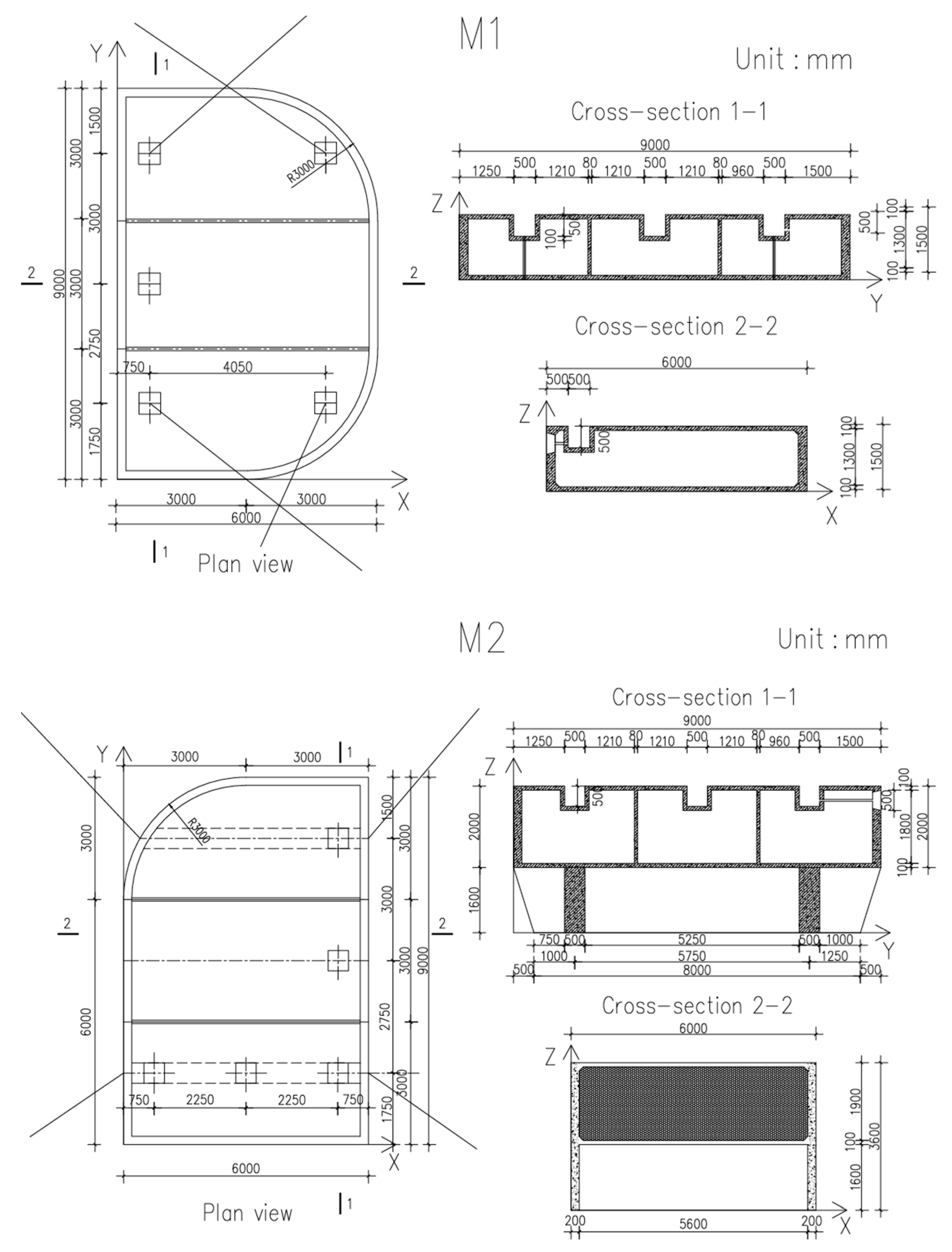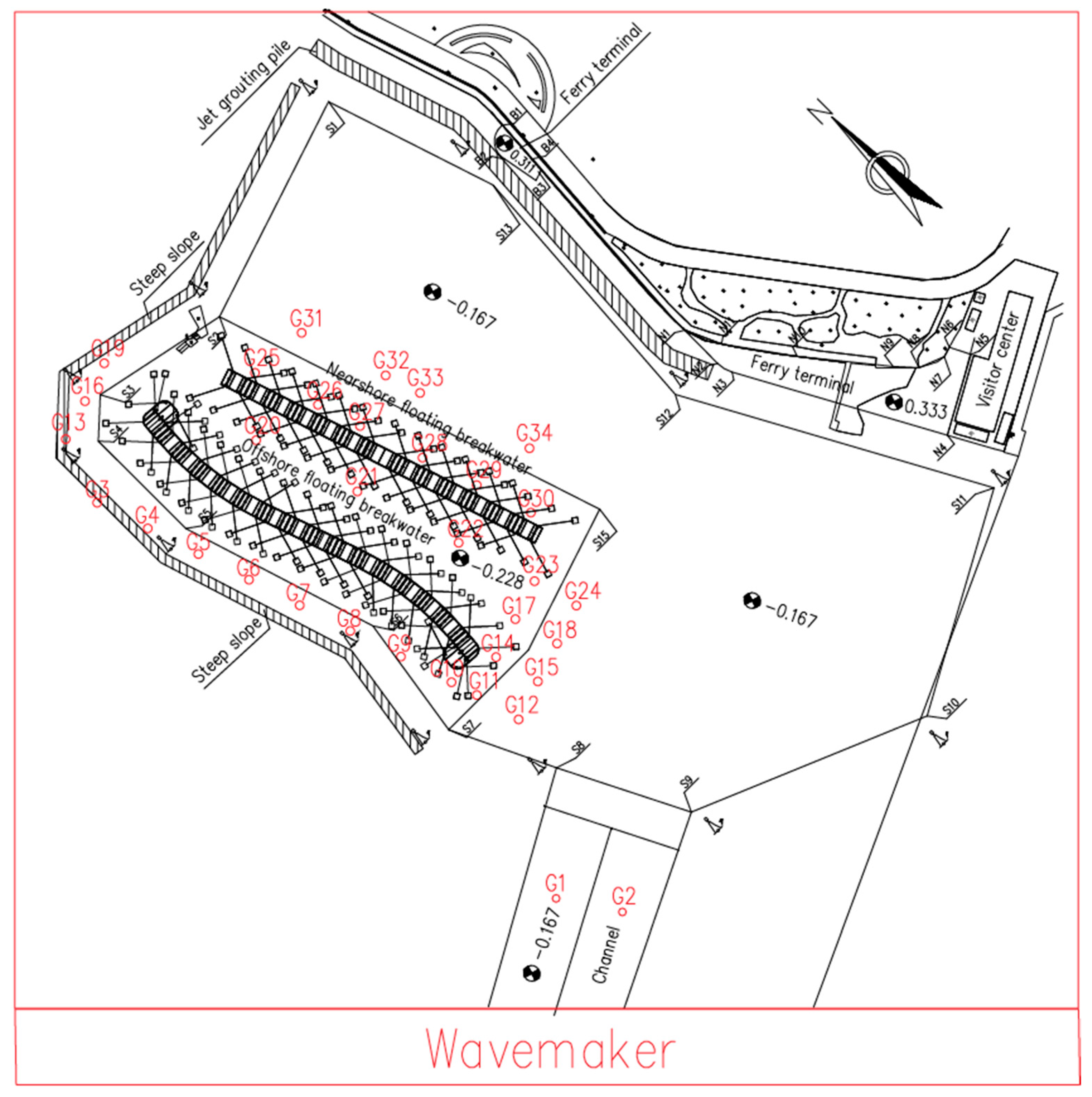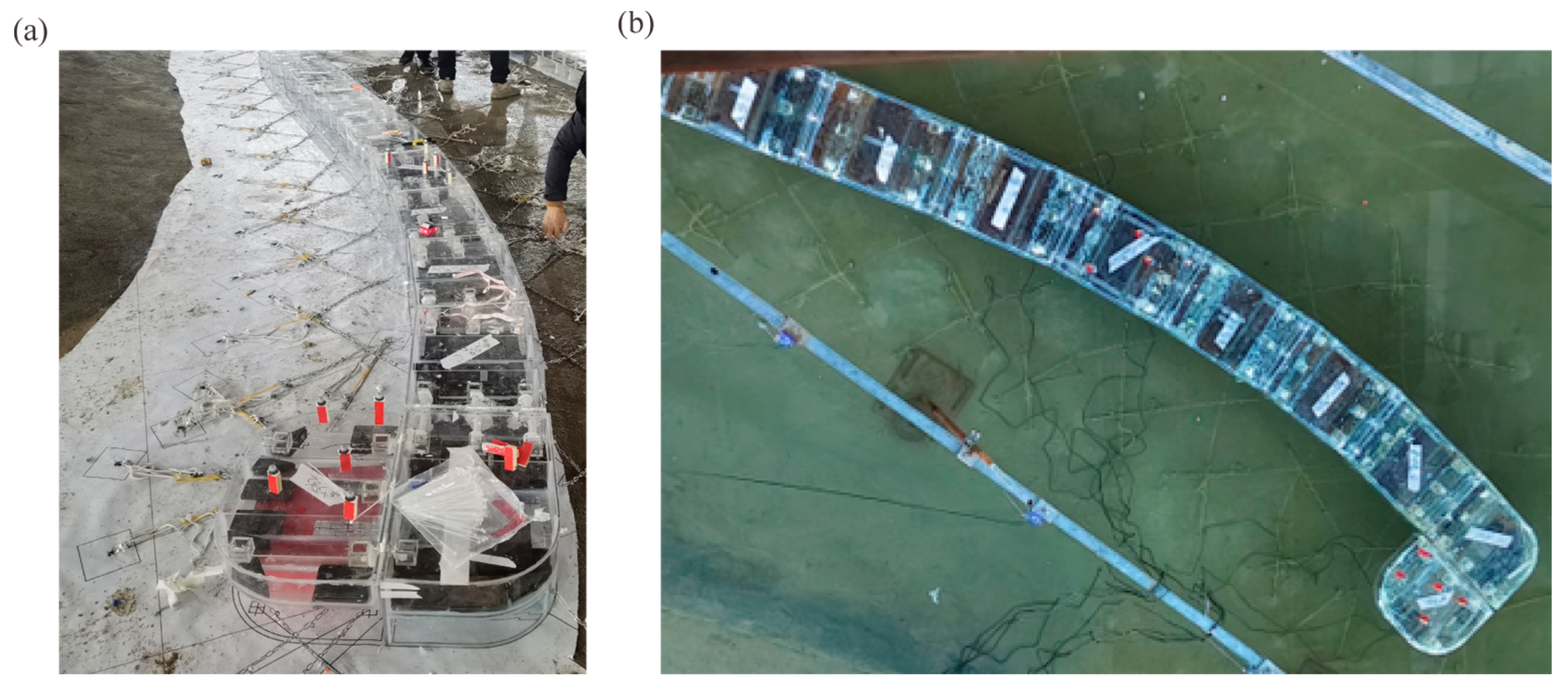 22] demonstrated that adding a wing plate can improve the wave attenuation performance of the FB, due to the increase in draft and wave-blocking area. The layout of FBs needs to be adapted to the protected area’s bathymetry. However, most studies focus only on straight layout without considering the influence of nearshore bathymetry and structures. In this work, a water tank experiment is conducted to investigate the wave attenuation performance, motion responses, mooring tensions, and surface wave pressures of streamlined-layout double-row FBs, designed for a Chinese port, under the realistic coastal environment. The examined FBs consist of winged box-type modules connected with flexible connectors.