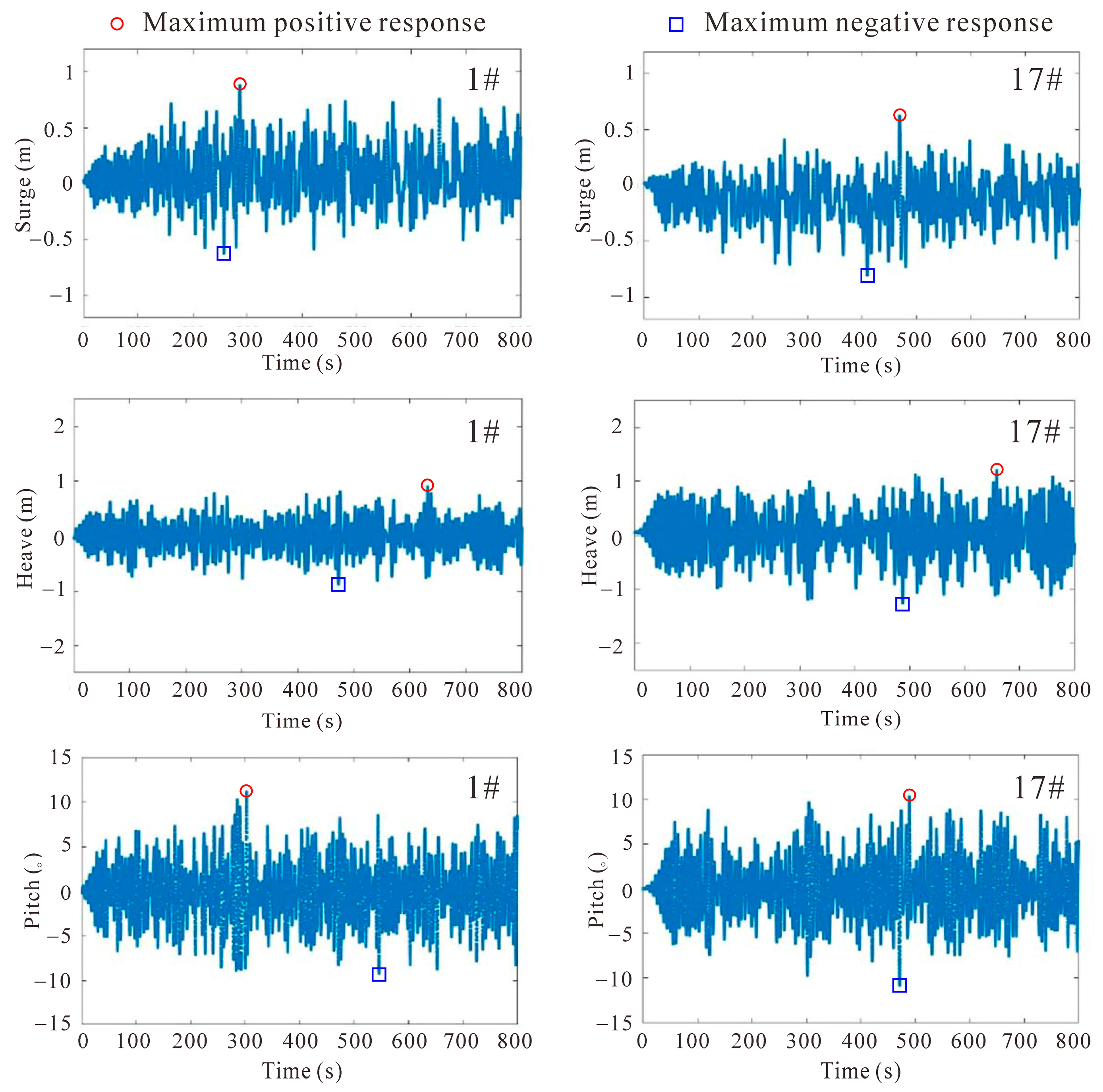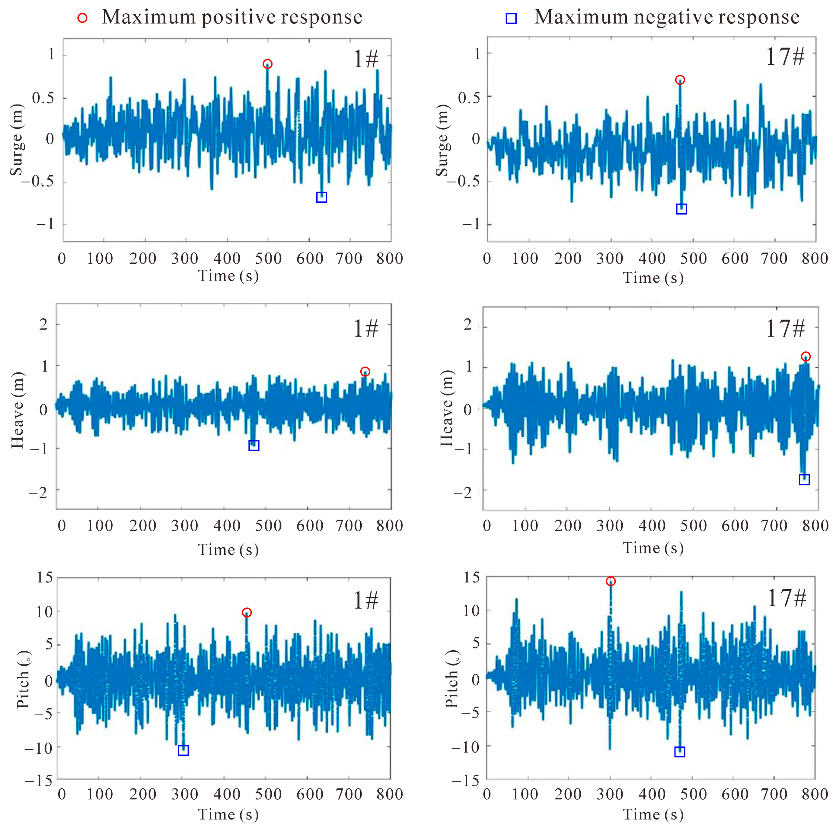 As wave height and period increase, the maximum amplitudes of the FBs’ motion responses change slightly. The maximum prototype-scale changes in surge, heave, and pitch amplitudes are +0.0625 m, −0.488 m, and +3.8523°, respectively. For surge motion, the overall response and the positive-direction amplitude of the head module are greater, while the tail module exhibits a larger negative-direction amplitude. For heave motion, the tail module demonstrates greater overall responses and motion amplitudes in both positive and negative directions. For pitch motion, the head and tail modules show comparable responses, but the latter is more sensitive to wave parameter variations.