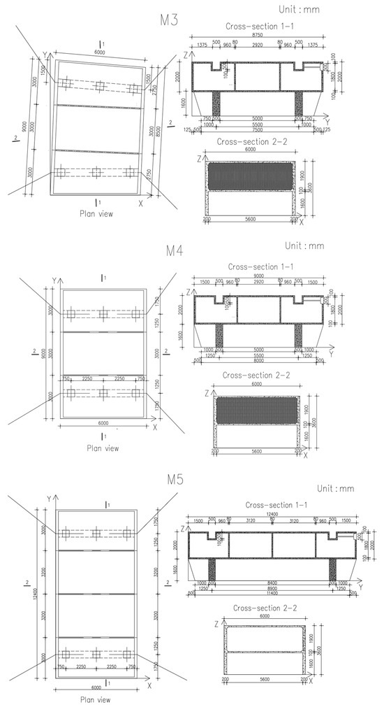 As Figure 1 illustrates, the double-row FBs designed for a Chinese port features a streamlined layout. The offshore breakwater is 150 m in length, while the nearshore one is 124 m, both with a 6 m width and separated by 30 m. The FBs comprise five types of modules (M1~M5), each featuring a box-type main structure with bottom-mounted wing plates and moored by four taut lines. Module dimensions and inter-module connection configuration are presented in Figure 2, and module weights and center-of-gravity positions are provided in Table 1.