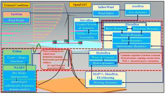 The computational framework developed in the present paper is numerically realized by adequately modifying/extending the simulation capabilities of OpenFAST as shown in Figure 2. In this figure, the red dotted line includes (a) the main OpenFAST modules that have been appropriately modified so that an HOWiWaES can be modeled using the generalized-mode approach and (b) the required computational tools for the relevant frequency-domain analysis of the floating system.