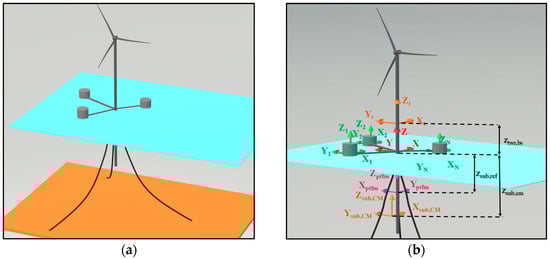 In Equation (17), is the mass of the FOWT’s floating platform, , r = 1, …, N is the mass of the r-th WEC with the corresponding i-th, I = NO + 1, …, M generalized DOFs, and and denote, respectively, the index number of the first and the last rotative DOF of the r-th WEC. Furthermore, is the HOWiWaES submerged part’s position vector between the XptfmYptfmZptfm and Xsub,CMYsub,CMZsub,CM coordinate systems with respect to XtYtZt (Figure 3b). This (3 × 1) vector can be calculated as follows: