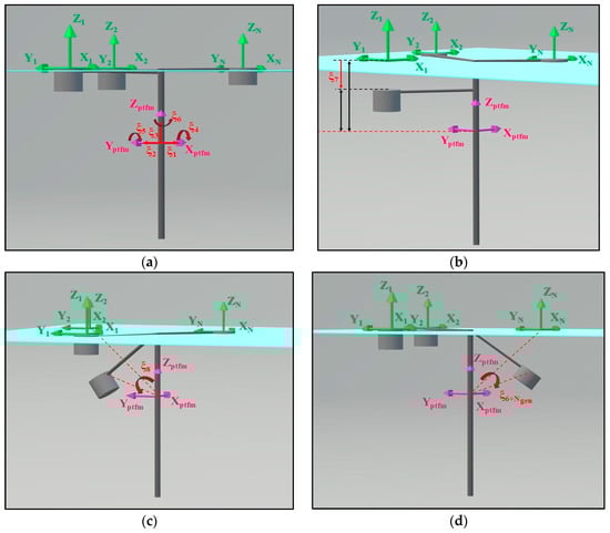 To further illustrate the above, Figure 4 shows an example of the generalized modes of an HOWiWaES floating substructure. For the sake of simplicity each WEC is assumed to have either a pure heaving motion (Figure 4b) or pure rotation (Figure 4c,d) relative to the FOWT’s platform (i.e., Nk = 1, k = 1, …, N and, hence, Ngen = N). Still, as already mentioned above, each WEC can be considered to move relative to the platform in more than one DOF.