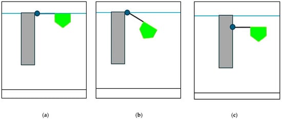 As for the WEC’s operation, two different operational cases are examined: (a) a pitching device (similarly to [26,27,28]), rotating around the arm’s joint, and (b) a pure heaving device. Accordingly, for each case one generalized DOF is taken into account corresponding, respectively, to a rotation (Figure 5b) and a vertical translation (Figure 5c) of the WEC relative to the FOWT. For both cases, five different PTO damping values are investigated, named as PTO 1, 2, 3, 4 and 5 (Table 2). For the pitching WEC, those values were obtained directly from [26], while for the heaving device they were calculated accordingly, using the PTO damping coefficients of the former WEC as a basis. It is also noted that, for comparison reasons, results related to the generalized DOF are presented in terms of the WEC’s vertical displacement relative to the MWL irrespective of the device operational mode.