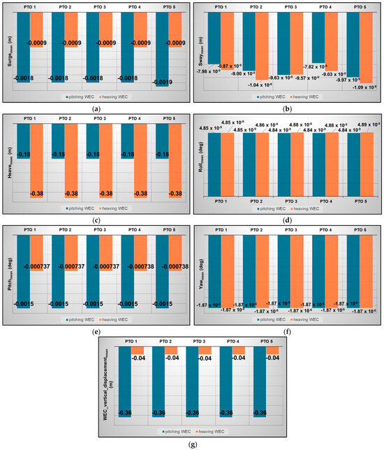 Static offsets of the WindWEC in (a) surge; (b) sway; (c) heave; (d) roll; (e) pitch; (f) yaw; (g) WEC’s vertical displacement for both pitching and heaving devices and for all PTO values examined.