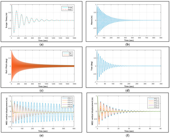 WindWEC free decay histories of (a) surge and sway; (b) heave; (c) roll and pitch; (d) yaw; (e) pitching WEC’s vertical displacement; (f) heaving WEC’s vertical displacement.