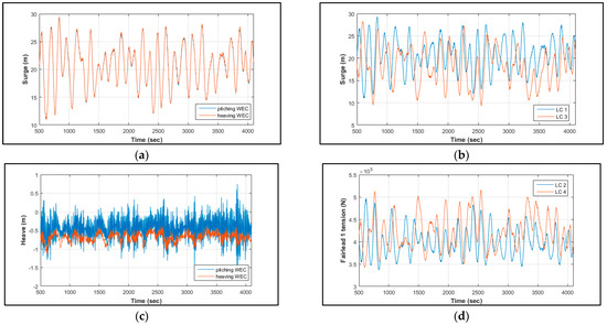 Time series of WindWEC’s (a) surge response with heaving and pitching WEC (LC 1); (b) surge response with pitching WEC (for LCs 1 and 3); (c) heave response with heaving and pitching WEC (LC 4); (d) windward (Line 1) fairlead tension with heaving WEC (LCs 2 and 4).