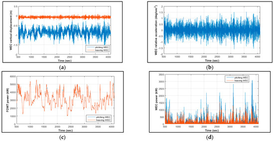 Time series of WindWEC’s (a) pitching and heaving WEC’s vertical displacement with regard to MWL (LC 2); (b) pitching WEC’s relative acceleration with regard to FOWT’ platform (LC 4); (c) FOWT’s produced power with pitching and heaving WEC (LC 3); (d) pitching and heaving WEC’s absorbed power (LC 1).