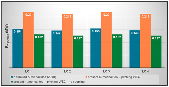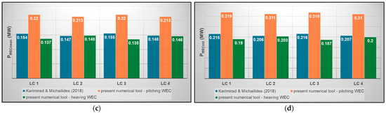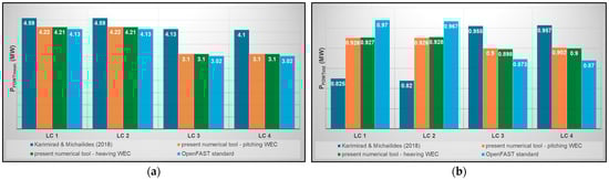 Focusing on the power produced by the FOWT (Figure 10a,b), the existence of insignificant differences in PFOWTmean and PFOWTstd for all LCs between the pitching and the heaving device in the case of the present tool’s application advocates the independence of the FOWT’s power produced by the WEC’s operational mode. When compared to [28], differences are observed in both PFOWTmean and PFOWTstd, with PFOWTmean values of the present numerical tool being ~25% lower for LCs 3 and 4. Still, the results of the present investigation are very close to those of the isolated FOWT. Accordingly, the former mentioned differences could be related to potential different modeling features/assumptions of [28] in the case of 30-degree wind heading.