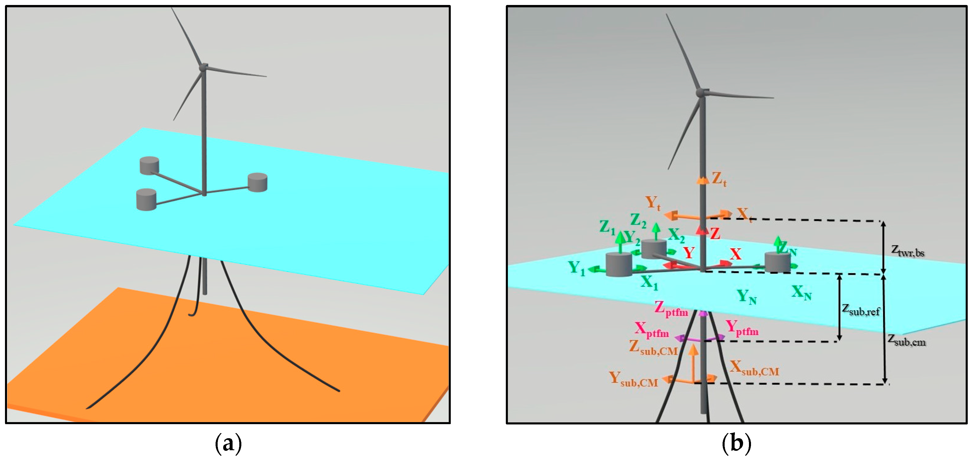 - Jonkman, J.M. FAST Coordinate Systems; National Renewable Energy Laboratory (NREL): Golden, CO, USA, 2005. [Google Scholar]