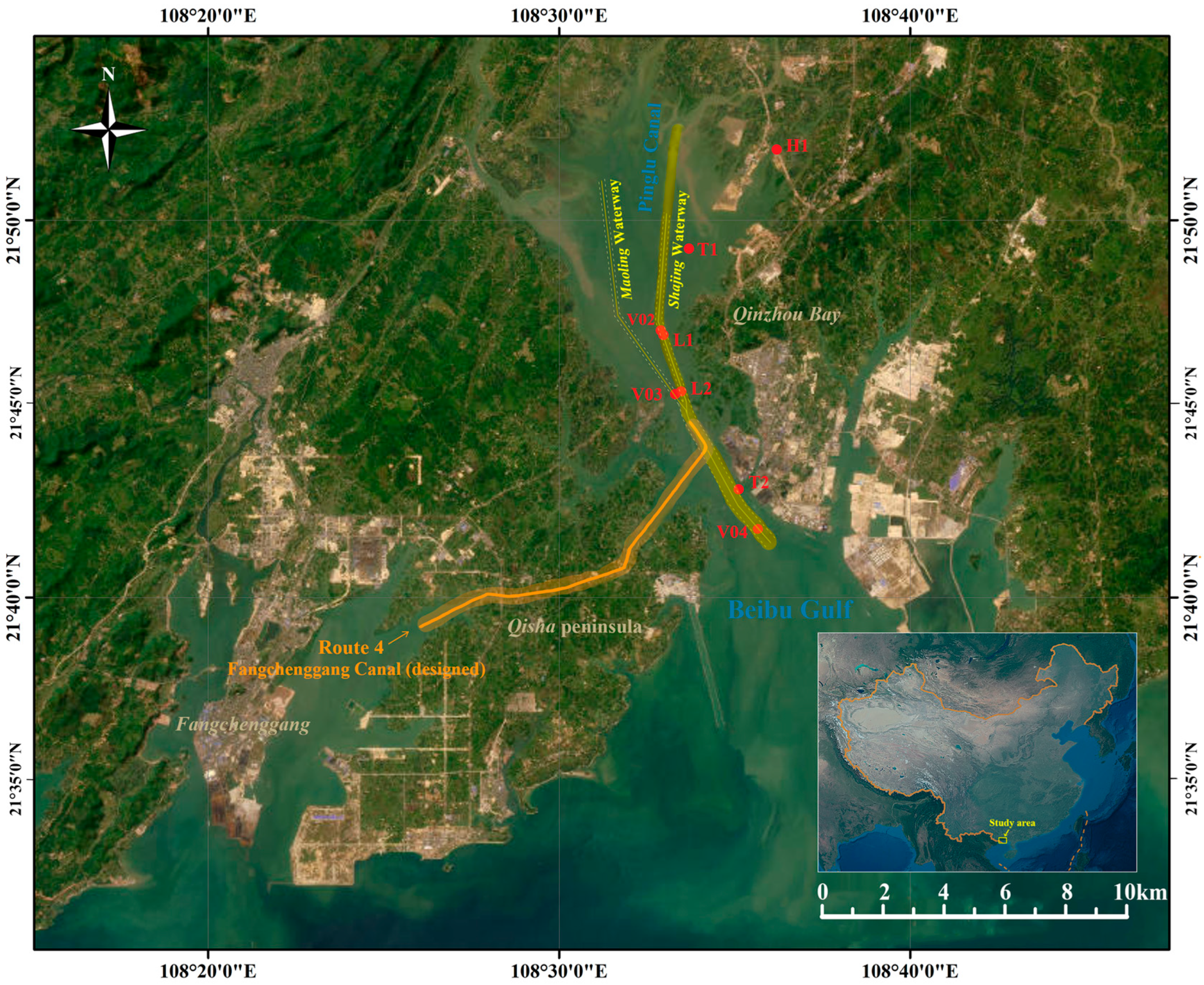- Feng, H.; Jin, Z.; Chu, X.; Wang, W.; Yao, H. Route Selection for the Extension Line of Pinglu Canal: A Comparative Study. Land 2025, 14, 1266. [Google Scholar] [CrossRef]