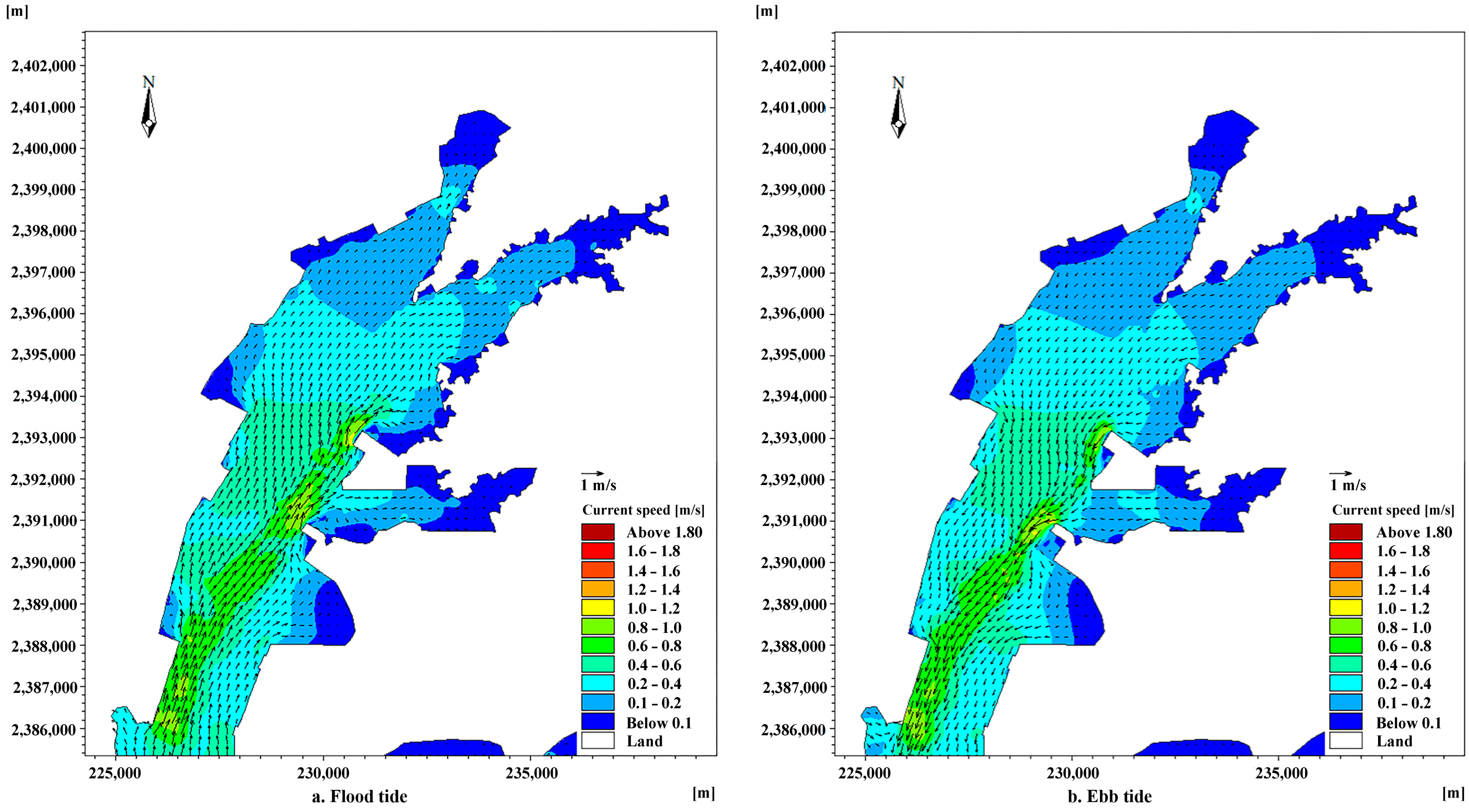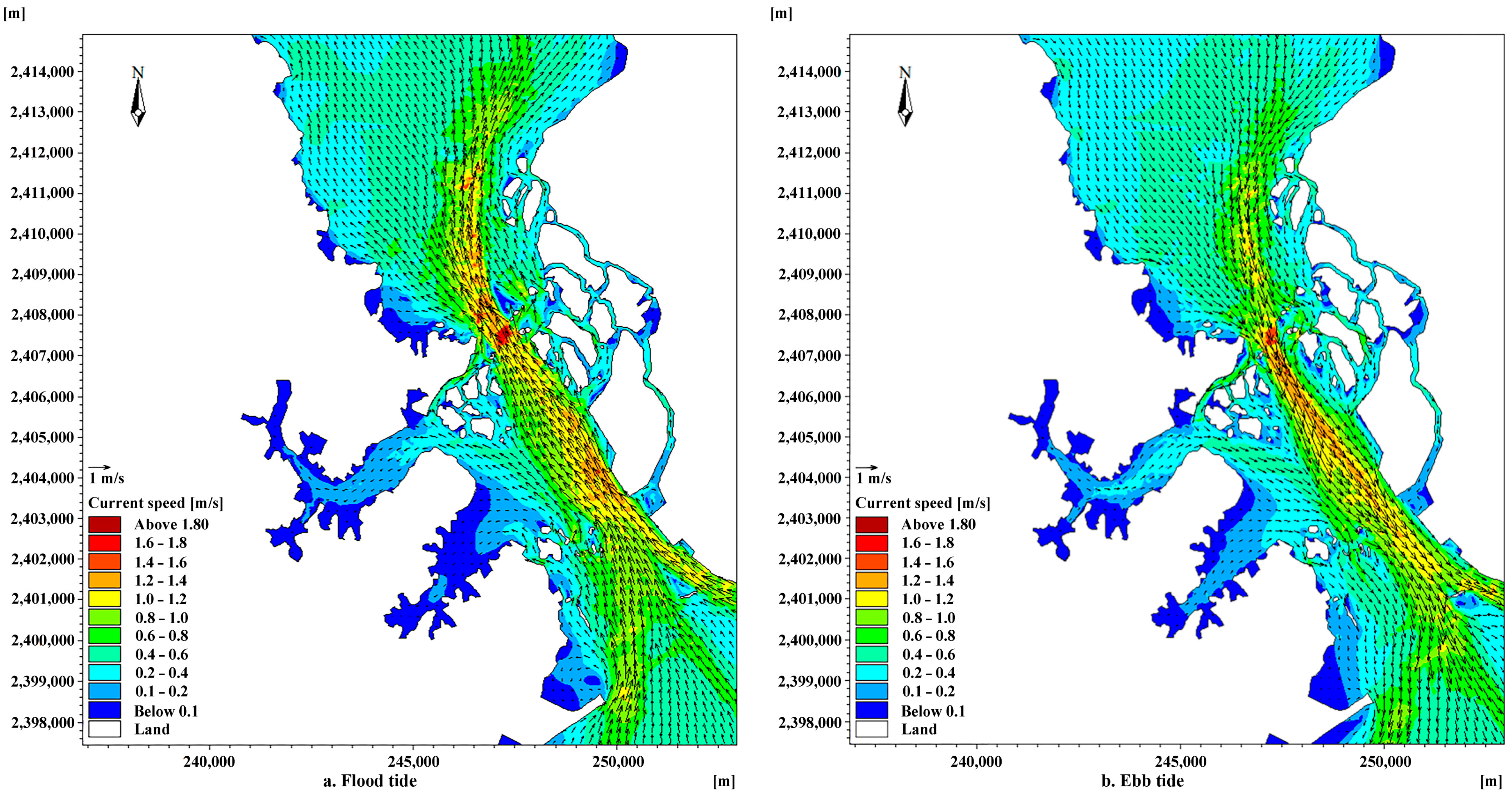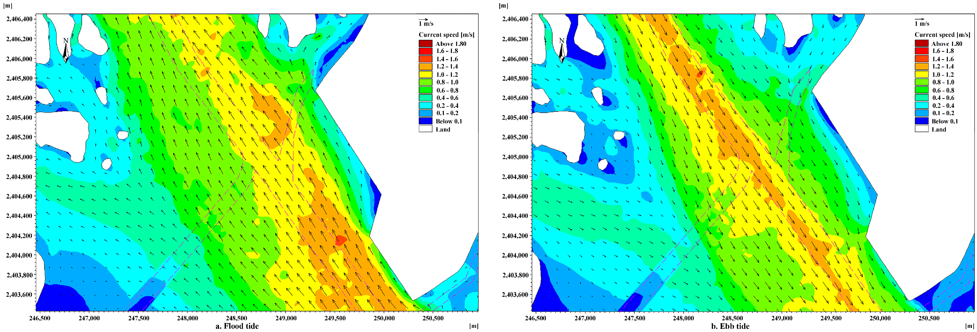 | Point | Maximum Flood Tide | Maximum Ebb Tide | Average Flow Velocity (m/s) | ||