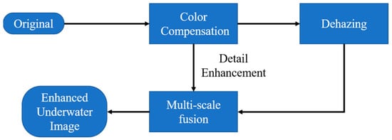 Color compensation is used to compensate for color casts caused by depth-selective absorption of color. The natural appearance of the image is restored by this process. With color compensation, dehazing algorithms and USM can be applied to underwater images. In the underwater defogging stage, an improved defogging algorithm is used to process the image. The depth information of the image is analyzed based on atmospheric light estimation and transmittance estimation. This process mitigates the reduction in contrast induced by underwater scattering, thereby recovering clarity and brightness. Multi-scale fusion is used to extract and enhance the edges and details of the image at different scales. The image is decomposed and reconstructed to alleviate the loss of contrast and detail caused by backscattering. The fusion steps are described in detail in Section 2.3.