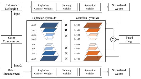 In A and B, the image was preprocessed using the color compensation white balance algorithm and the dual channel prior algorithm. These methods were utilized to enhance the contrast of the image and correct the color shift problem. However, the improvement of a single feature alone is still insufficient to achieve the desired visual effect of the enhanced image. On this basis, a multi-scale fusion strategy is introduced in this section. The fusion weight of the image is defined to further improve the image quality. Firstly, the Laplacian contrast weight (WL) is utilized to calculate edge and texture information in the image. Secondly, the saliency weight (WS) is used to determine the importance of the highlighted areas in the image. Finally, the saturation weight (WSat) is employed to measure the richness of colors in the image. With these weights, different features of the image can be fully considered. Subsequently, a multi-scale fusion method based on pyramid decomposition is applied to further enhance the preprocessed image. Specifically, the color-corrected image and underwater dehazed image obtained in the first two sections serve as input to the fusion algorithm. According to the multi-scale fusion strategy, the input image and its normalized weight map are subjected to multi-scale decomposition and fusion. This process aims to maximize the advantages of the two images. Ultimately, it obtains an underwater enhanced image with richer global contrast and detailed information.