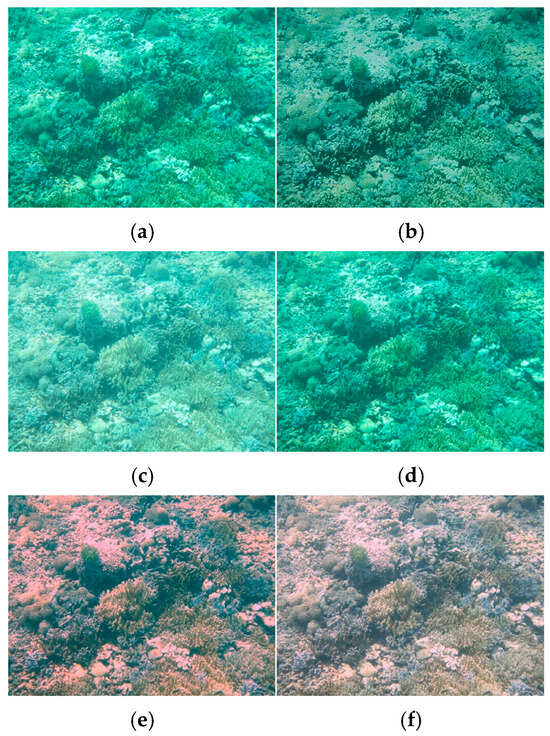 In the equation, the red and green channels of image I are, respectively, represented by Ir and Ig. Each channel is normalized by the upper limit of the dynamic range. The values are placed in the interval [0, 1]. The average values of Ig and Ir are represented by and . The parameter d is set as a constant, which is 1 in this context. According to the study by [15], significant attenuation of the blue channel is caused by the absorption of organic matter in turbid waters or places with high concentrations of plankton. Therefore, in these cases, the blue channel is strongly attenuated and the red channel is undercompensated. The compensated blue channel Ibc is calculated as follows: