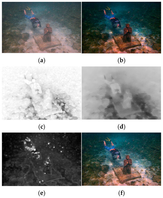 The comparison effect between DCP and dual channel prior is shown in Figure 5. The original image has been color compensated. Figure 5b,c depict the propagation diagram and processing results of traditional DCP, respectively. The visibility of the image is improved to a certain extent by traditional DCP. However, the image contrast is high, and an obvious color cast is present. The entire image is biased toward red. Many blocking artifacts are observed at the bottom of the stone statues and at the edges of the images. Additionally, numerous artifacts are present on the transmission map, contributing to noise. In comparison with traditional DCP, the improved dual channel prior is found to be more effective, as depicted in Figure 5d–f. When comparing the transmission maps in Figure 5c with Figure 5d,e, it is evident that the improved dual channel prior transmission map provides more detailed information. The transition is smoother, resulting in a better effect in Figure 5f. The dual channel prior not only addresses color distortion effects, but also further improves visibility. Combined with the quantitative data in Table 2, it is found that the underwater image has better image quality after the dual channel prior. The structural similarity of the image is greatly improved.