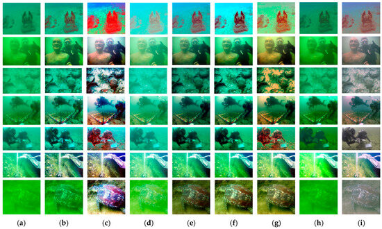 Due to the influence of the underwater environment, images in the underwater image dataset usually exhibit color casts, haze, low brightness, and noise. These factors result in extremely low visibility levels. Seven representative underwater images of different scenes were selected as the research objects for comparison. They were compared with CLAHE, HE, Gamma Correction (GC) [26], Integrated Color Model (ICM) [27], Relative Global Histogram Stretching (RGHS) [28], Unsupervised Color Correction Method (UCM) [29], and Minimum Information Preservation (MIP) [30]. Figure 6a–h, respectively, depict the original images of the seven groups. They also show the renderings after processing using the aforementioned seven classic algorithms: (i) represents the processing renderings of the algorithm in this article.