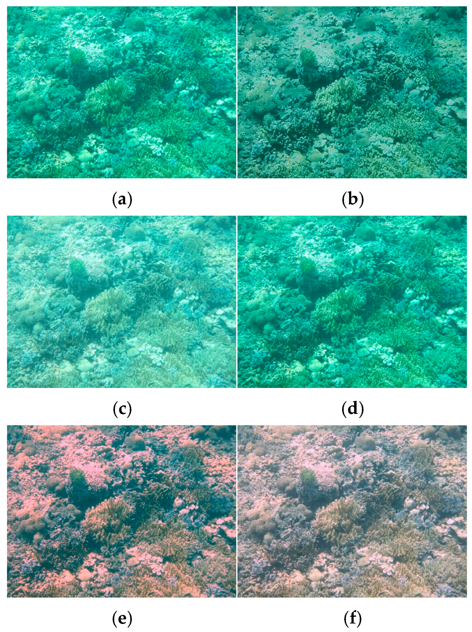 - Huang, D.; Wang, Y.; Song, W.; Sequeira, J.; Mavromatis, S. Shallow-Water Image Enhancement Using Relative Global Histogram Stretching Based On Adaptive Parameter Acquisition. In MultiMedia Modeling; Springer International Publishing: Cham, Switzerland, 2018; pp. 453–465. [Google Scholar]
