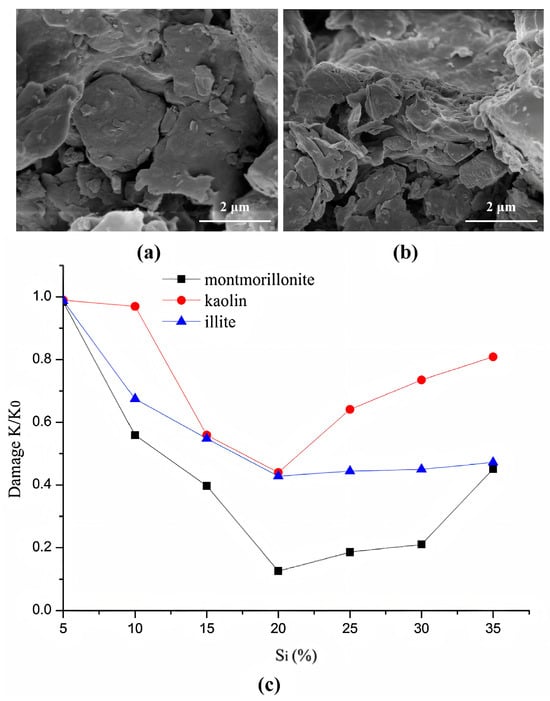 (a) and (b): SEM images of montmorillonite before and after hydrate dissociation at 22.5% hydrate saturation; (c) Permeability damage values of montmorillonite, kaolinite, and illite specimens before and after hydrate dissociation across experimental groups (Wu et al. [32]).