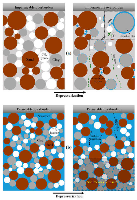 Sun et al. [38] simulated depressurization-induced hydrate dissociation under confined and unconfined conditions. In confined settings, minimal water/sand production and negligible permeability damage occurred, as dissociation-generated water was constrained by capillary forces or clay absorption. Pre-existing clay aggregates from hydrate formation limited further permeability damage from particle swelling and migration. In unconfined settings with seawater intrusion, vertical pressure gradients and salinity changes intensified clay swelling and migration, causing upper particle compaction, continuous pressure buildup, and significant permeability damage. As shown in Figure 3, depressurization yielded distinct responses. Confined environments exhibited immobilized pore water, minimal particle activity, and unimpeded gas flow, while unconfined conditions featured pronounced downward clay migration, compaction, and swelling.