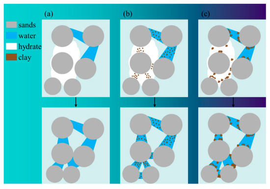 Schematic diagrams of pore microstructure before and after pore-filling hydrate dissociation: (a) without clay particles in pore water; (b) with montmorillonite in pore water; (c) with illite in pore water (Feng et al. [45]).