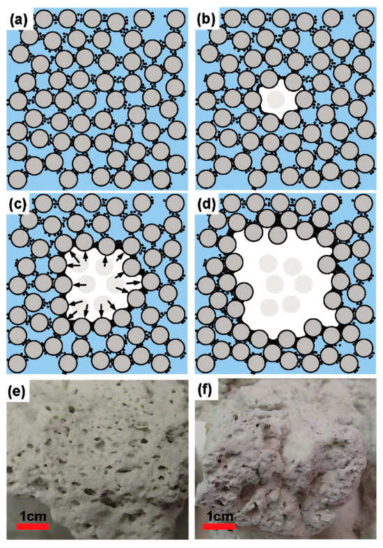 (a) Schematic of Ottawa sand structure before hydrate dissociation; (b,c): Expanding bubbles drive clay particle and sand grain migration, with clay particles accumulating at water–gas interfaces; (d) Cavity structures form while sand pore throats become clogged; (e,f): Ottawa sand samples with formed cavity structures (Jung et al. [51]).