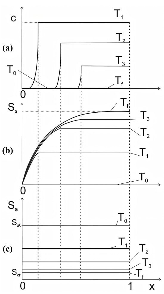 where c and σ are the suspended and retained particle concentrations, respectively, U is the Darcy flow velocity, D0 is the initial erosion front velocity, λ is the filtration coefficient, and kdet is the detachment coefficient [42,54,55].