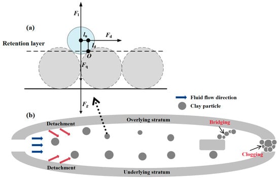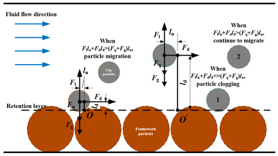 Firstly, force analysis is conducted on the particles. According to Saffman’s lift theory [61] and colloidal stability (DLVO theory), the forces acting on the particles are determined as follows: gravitational force Fg, electrostatic attraction Fq from matrix particles, lift force Fl, and drag force Fd from fluid flow [42,62,63]. The schematic diagram of force analysis is shown in Figure 7. In Figure 7a, the light blue circle at the top represents the study object, while the dashed gray circle at the bottom represents a virtual matrix particle. Figure 7b illustrates the behaviors of particles in porous reservoir media under environmental changes, including detachment and migration, bridging at pore throats, and clogging. In terms of force effects, both gravitational force and electrostatic attraction from the matrix exhibit adsorption effects on particles, while fluid forces promote particle migration.