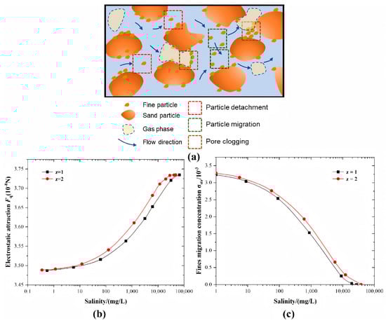 (a) Mechanism of particle detachment and migration (Han et al. [67]); (b,c), relationships of salinity with electrostatic attraction and particle migration extent, respectively, (modified from: Cui et al. [62]).