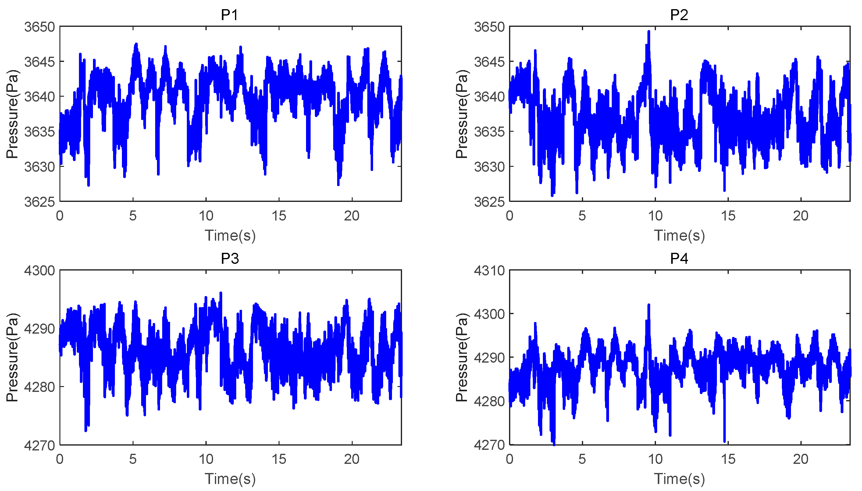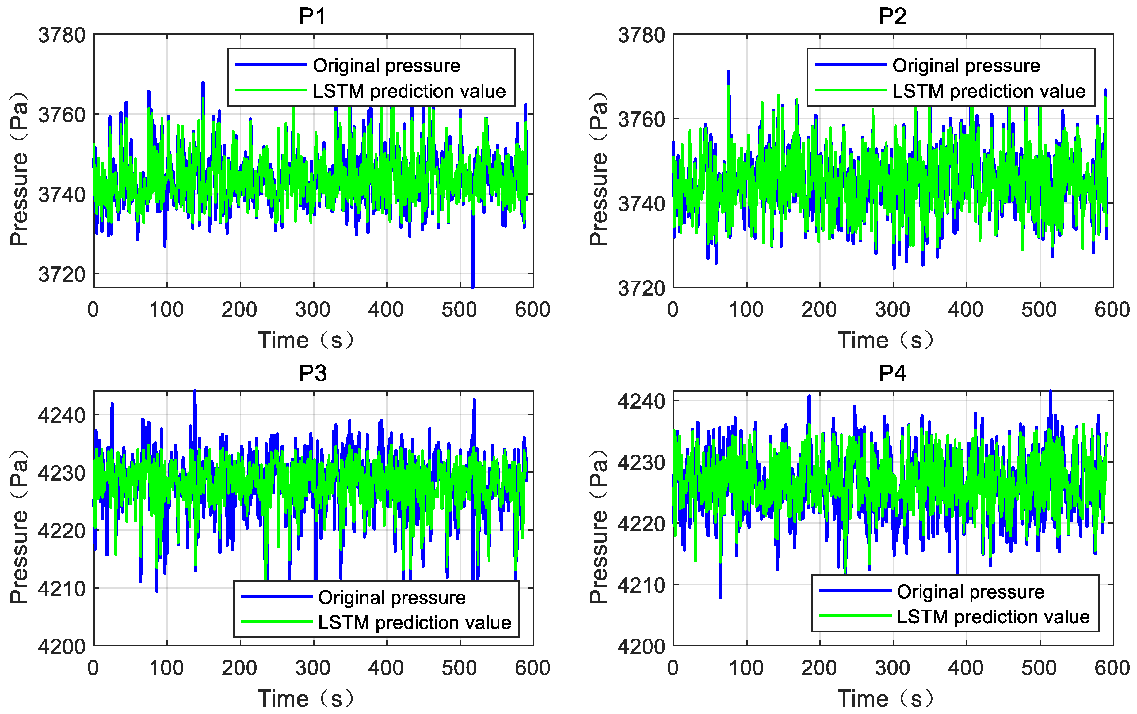 Table 2. The proposed LSTM prediction model demonstrated outstanding performance on the test set: it achieved an average MAE of 2.2497 Pa and an average RMSE of 3.0337 Pa across the four air chambers, with a mean R