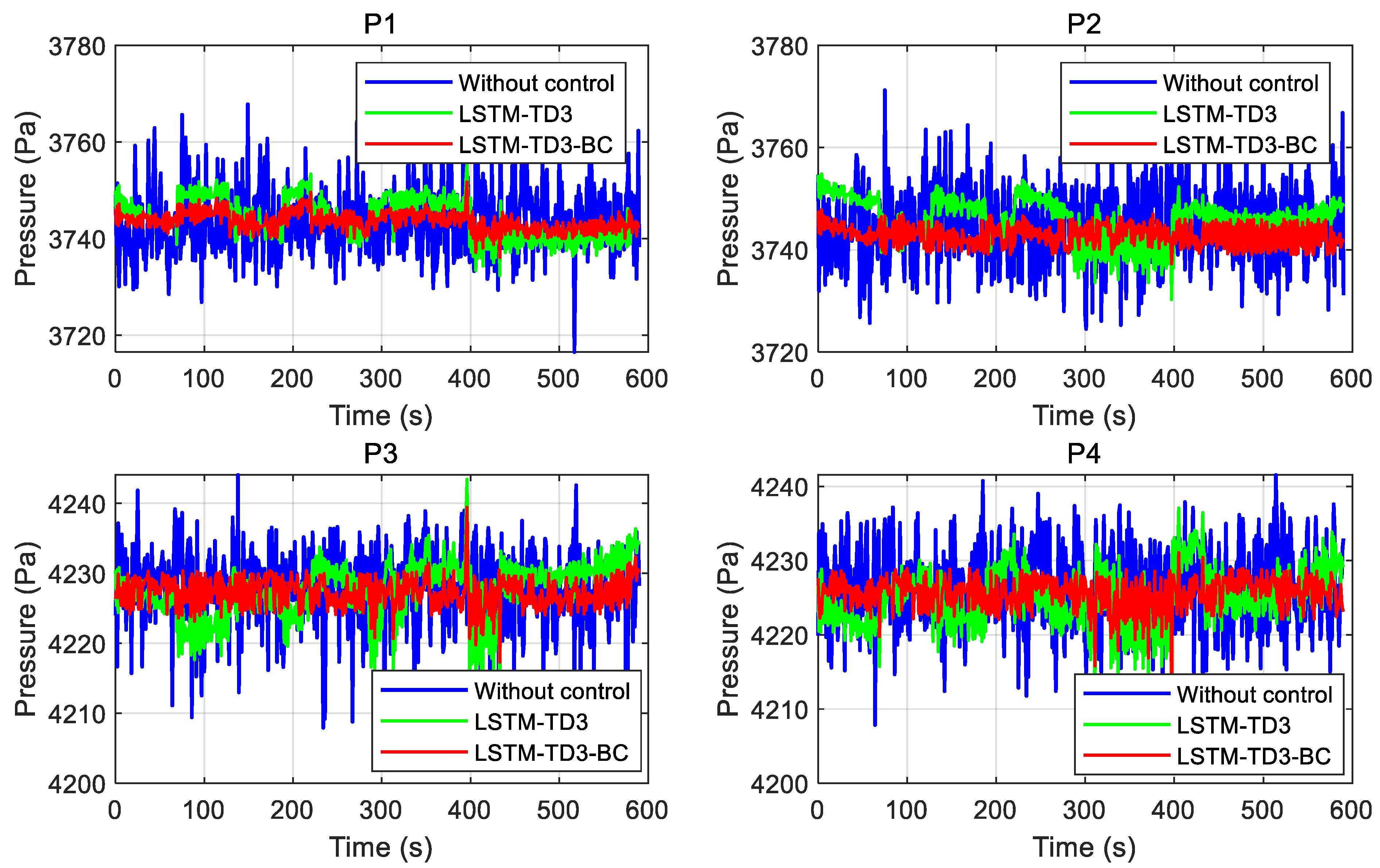 Figure 9, compared to the uncontrolled cushion pressure and the LSTM-TD3 control algorithm, the proposed adaptively weighted LSTM-TD3-BC reinforcement learning algorithm effectively maintains the chamber pressure within the desired range with smoother adjustments.