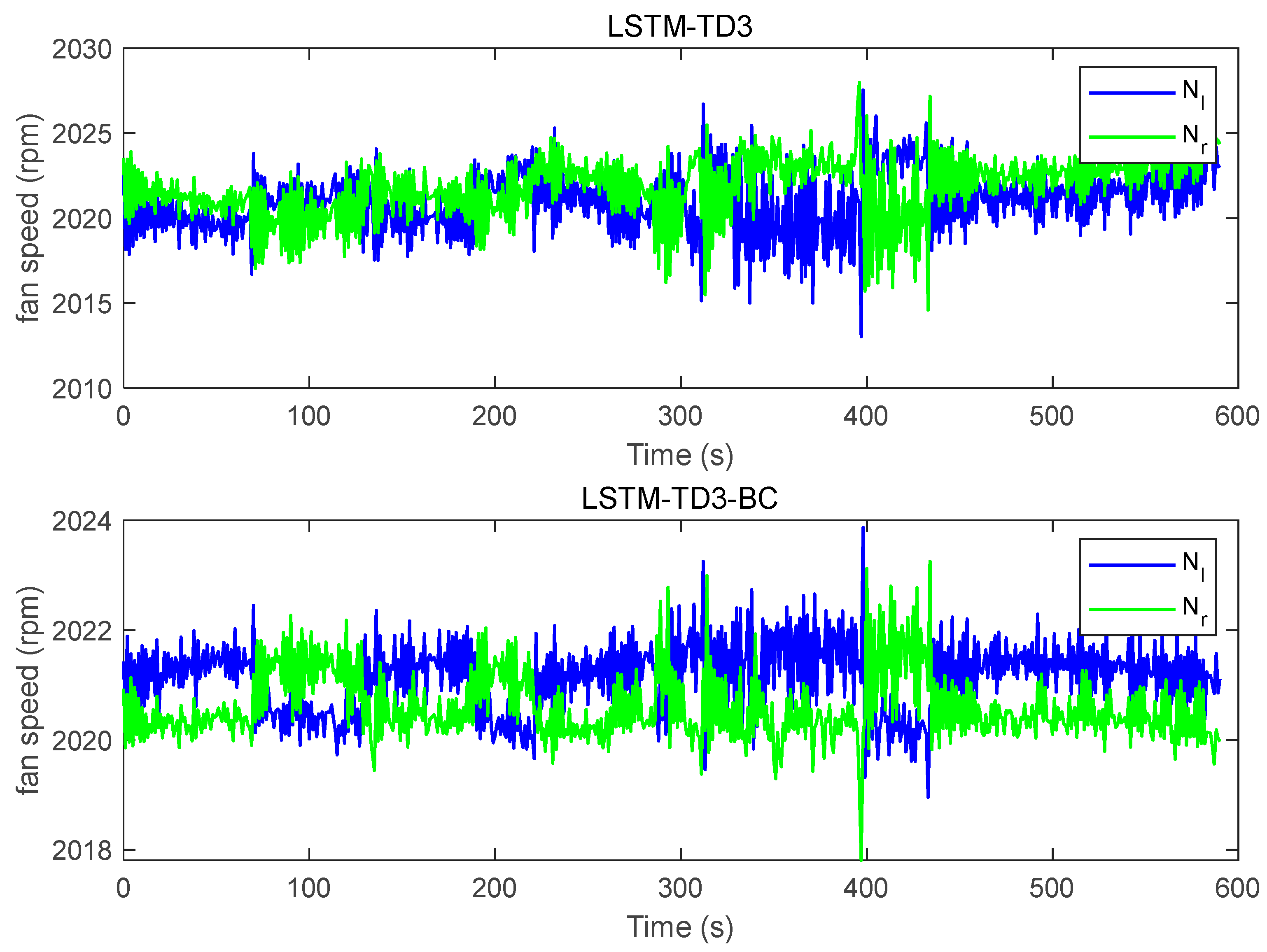 Figure 10 illustrates a comparison of lift fan speeds under different control algorithms. In contrast to the LSTM-TD3 method, the proposed adaptive LSTM-TD3-BC results in smaller fluctuations in fan speed, which not only stabilizes cushion pressure but also contributes to prolonged fan service life. The instantaneous reward curves are depicted in