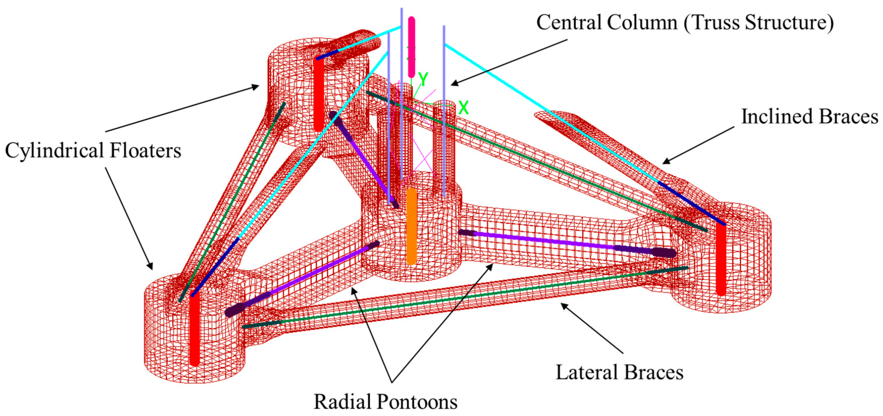 7] developed the WindStar TLP with three corner columns and a central tower-mounted column, achieving a pitch natural frequency of 0.248 Hz—strategically positioned between the NREL 5 MW turbine’s 1P and 3P frequencies to avoid resonance. Ren et al. [