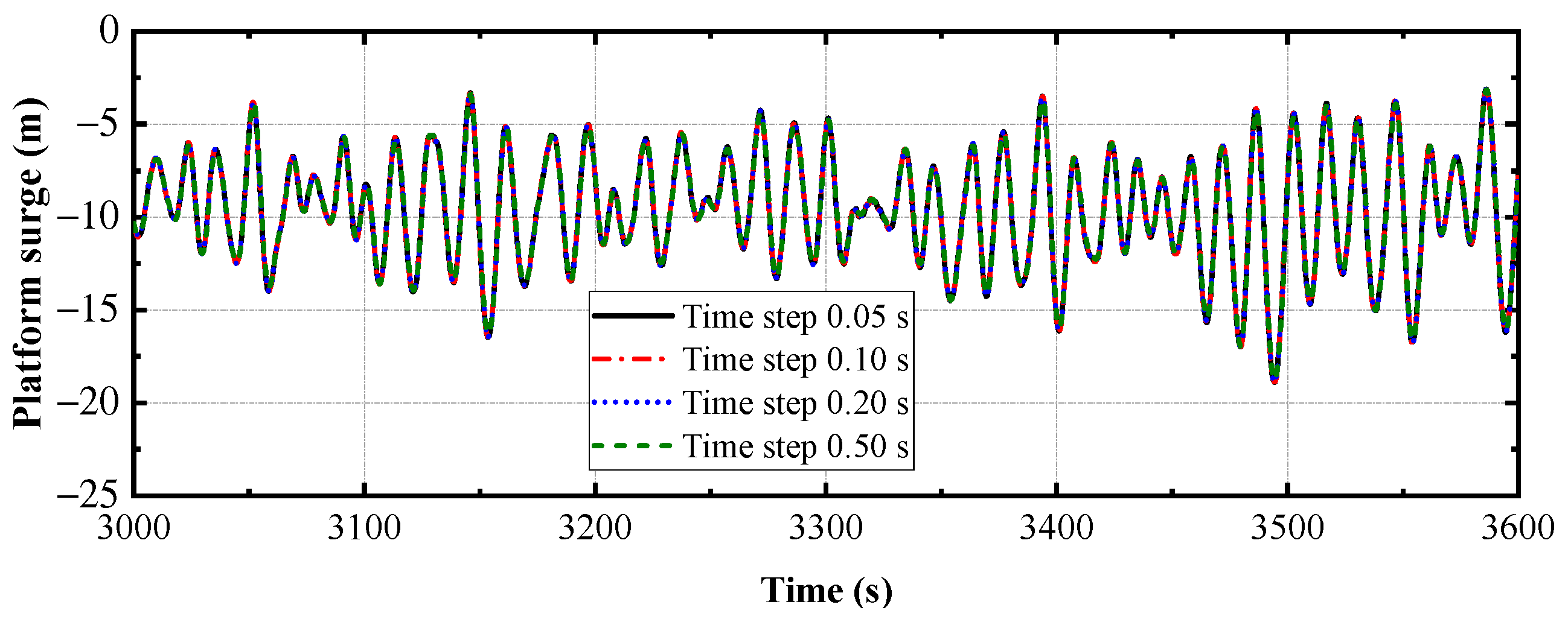 28]. The model advances beyond previous implementations by explicitly incorporating tower flexibility and fully coupled wind–wave–current loading. This foundation ensures the reliability of simulation results for the TLP FOWT’s response under extreme sea states, making the findings applicable for practical engineering design. Future work will utilize this validated model for detailed analysis of tendon vortex-induced vibrations (VIV) and fatigue life.