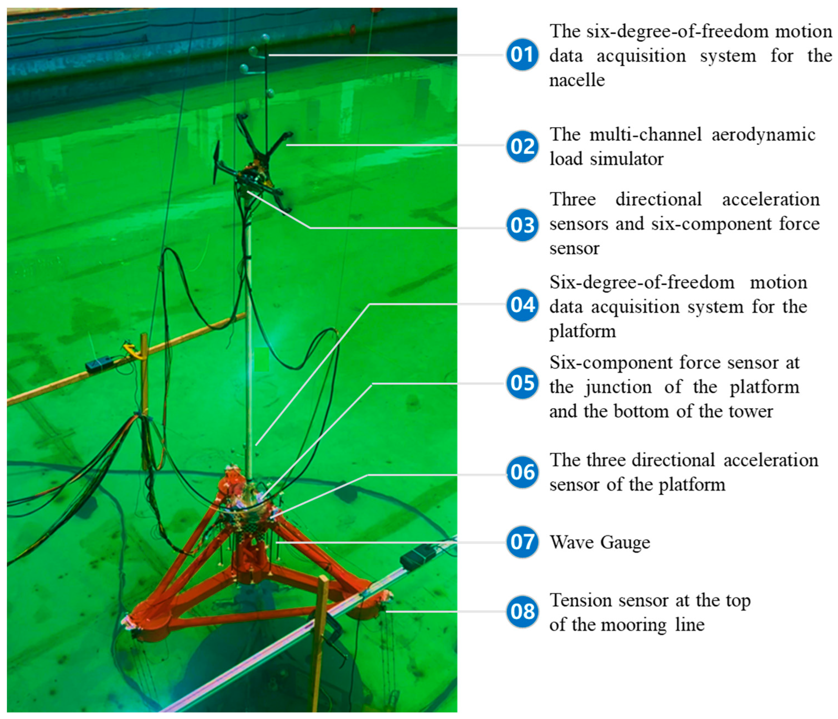 10] conducted 1:36.67 scale tests of the Iberdrola TLPWIND concept using a software-in-the-loop approach, where a modified FAST code calculated real-time aerodynamic thrust, and a fan applied these loads to the model. This method resolved Reynolds number mismatches (a common issue with scaled rotors) and confirmed that the TLP’s surge natural period avoided wave resonance, aligning with numerical predictions. Song and Lim [